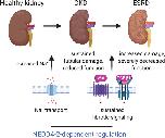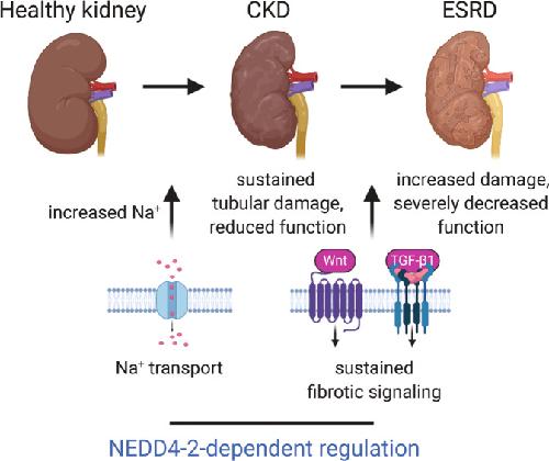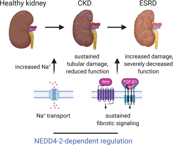 Fig. 8. A model of NEDD4-2-dependent control of kidney disease progression.NEDD4-2 regulates several molecular processes that contribute to the progression of kidney disease, including Na+ transport and fibrotic signaling pathways. This occurs through ubiquitination of substrates such as ENaC (and other channels and transporters) as well as downstream components of Wnt/β-catenin/TGF-β1 signaling pathways. In the absence of NEDD4-2, increased Na+ contributes to sustained tubular damage with a mild reduction in kidney function. Sustained signaling through Wnt and TGF-β1 pathways, particularly as a result of high dietary Na+, drives increased kidney damage and severely decreased renal function suggesting progression from CKD to ESRD. Figure created with BioRender.com.