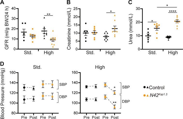 Fig. 1. High dietary Na+ exacerbates renal disease in Nedd4-2Ksp1.3 mice, independently of hypertension.A GFR calculated from 24 h urine and blood collection after 17 days of standard (Std.) or high Na+ diet. B, C Serum creatinine and urea levels after varied diets. D BP measured by noninvasive tail-cuff averaged over 3 days for each time point. Pre: before the commencement of diet, Post: at the conclusion of varied Na+ diet. SBP systolic blood pressure, DBP diastolic blood pressure. A–C Significance determined using an unpaired two-tailed Student’s t test (means ± SEM). D Significance determined using one-way ANOVA of repeated measurements (means ± SEM, n = 9–11). *P < 0.05, **P < 0.01, ****P < 0.0001.