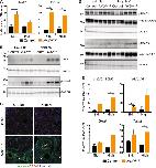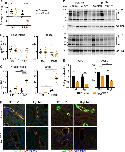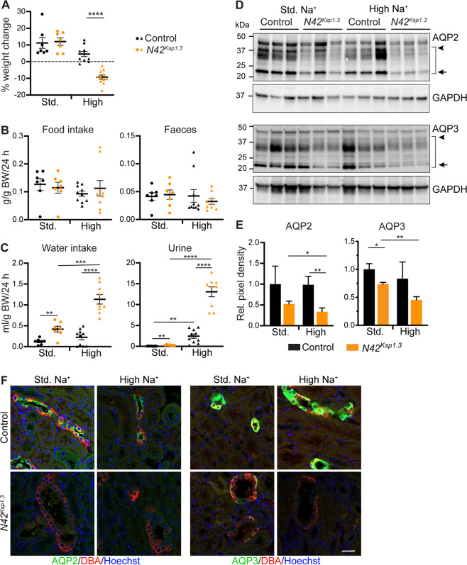 Fig. 2. Weight loss, polyuria and AQP loss are associated with kidney disease in Nedd4-2Ksp1.3 mice.A Weight change at the conclusion of 17 days of the diet. B Food intake and feces produced or C water intake and urine output, over 24 h in metabolic cages. D Immunoblot analysis of AQP2 and AQP3 with GAPDH as a loading control. Arrow indicates unglycosylated form, arrowhead indicates highest glycosylated form. The area within the bracket represents quantitated region. E Quantitation of AQP immunoblots normalized to GAPDH loading control. F Immunostaining of AQP2 or AQP3 (green) with DBA marker for collecting ducts (red). DNA is stained by Hoechst (blue). Scale bar: 50 μm. Data presented as means ± SEM and significance determined using one-way ANOVA of repeated measurements (A), unpaired two-tailed Student’s t test (B, C), or presented as means ± SD with significance determined using unpaired two-tailed Student’s t test (E). *P < 0.05, **P < 0.01, ***P < 0.005, ****P < 0.0001.