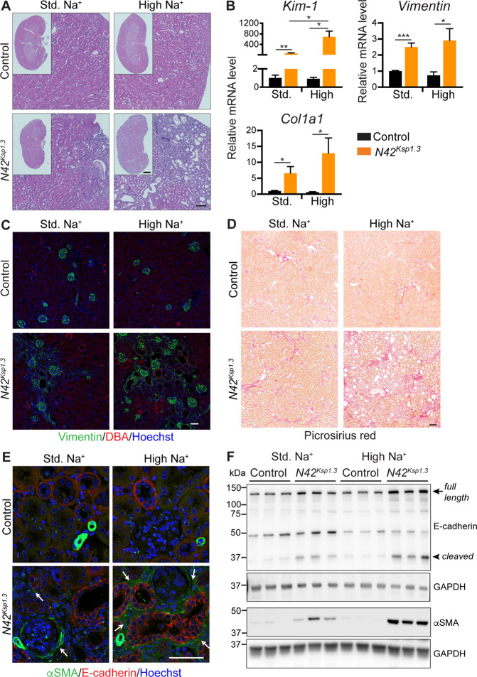Fig. 3. Kidney injury is characterized by ECM accumulation and fibrosis.A Haematoxylin and Eosin staining, scale bar: 100 μm, 1 mm for inset. B qRT-PCR analysis of Kim-1, Vimentin, and Collagen 1 (Col1a1) relative to TATA-box binding protein (TBP). C Immunostaining of vimentin (green) with DBA marker for collecting ducts (red). DNA is stained by Hoechst (blue). Scale bar: 50 μm. D Picrosirius red staining of collagen, scale bar: 100 μm. E Immunostaining of αSMA (green) and E-cadherin (red). DNA is stained by Hoechst (blue). Arrows indicate regions of αSMA positive interstitium. Scale bar: 50 μm. F Immunoblot analysis of E-cadherin and αSMA with GAPDH as a loading control. Arrow indicates full-length E-cadherin, the arrowhead is 30 kDa cleaved form. Data in B presented as means ± SEM and significance determined using unpaired two-tailed Student’s t test, n = 3–4. *P < 0.05, **P < 0.01, ***P < 0.005.