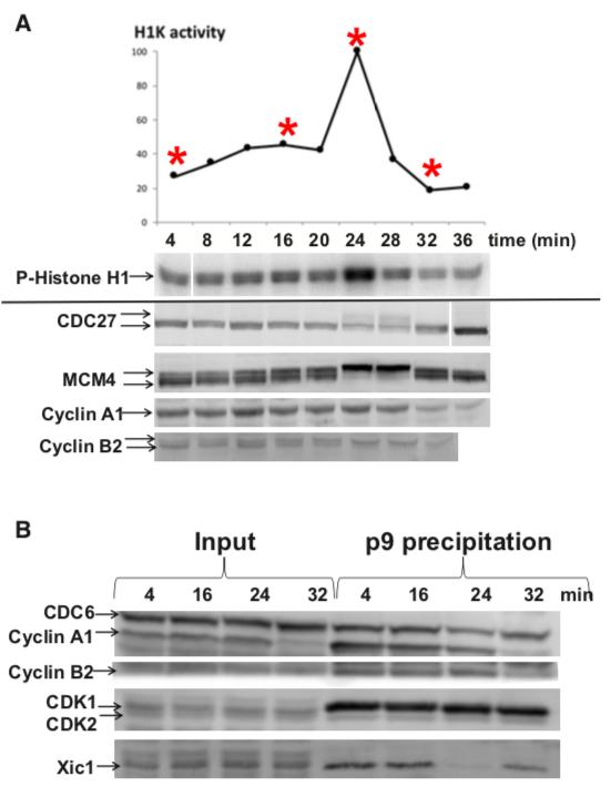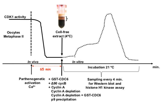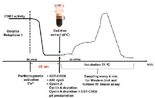 post oocytes parthenogenetic activation, i.e. before the time of CDK1 activation and incubated them at 21oC and sampled for histone H1 kinase assay or CDC27, MCM4 Western blotting during the mitotic period every 4 minutes. Before incubation, the cell-free extracts were depleted of cyclin A, or different proteins were added in the combinations listed above.
