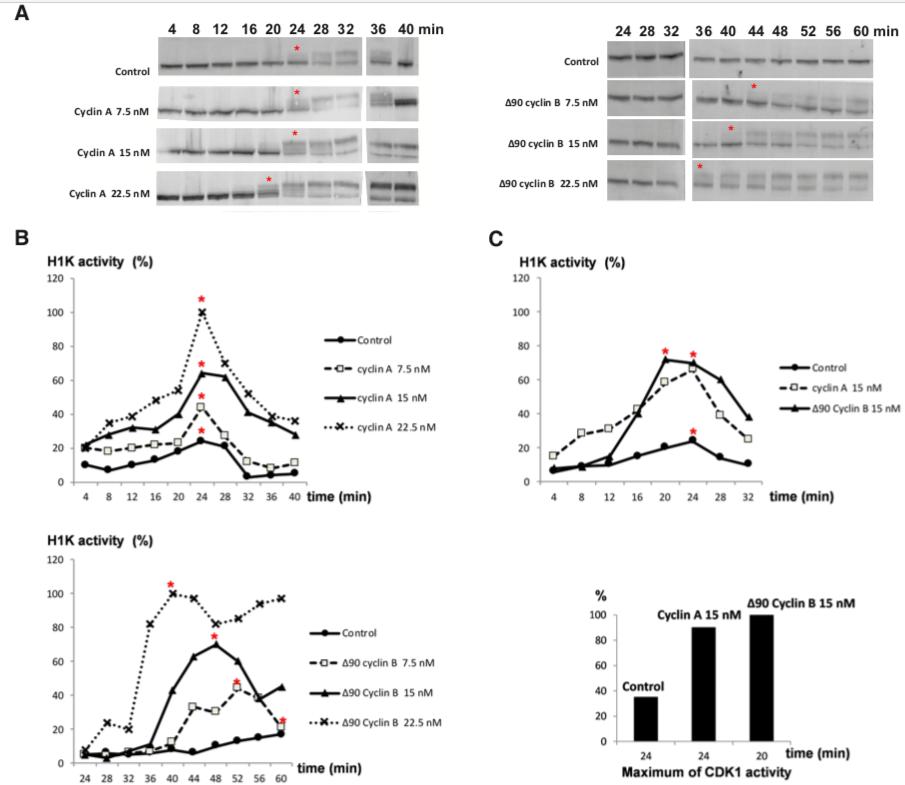 Fig. 2. Dose-dependent effects of cyclin A and Î90 cyclin B addition on the M-phase entry and progression. (A) The cytoplasmic extract was incubated at 21°C in the presence of three concentrations of purified cyclin A or Î90 cyclin B (7.5, 15, and 22.5 nM) then sampled every 4 min. Samples were analyzed by 8% SDS-PAGE followed by CDC27 Western blot. The dynamics of CDC27 phosphorylation were compared to control. Red asterisks indicate the time points when a substantial shift in CDC27 migration was observed, and which were assumed to be the M-phase entry. Note that the Western blots shown here are the compilation of two separate membranes in each lane because the samples of 4-32 min time points were run and blotted separately from the 36â40 min samples in the series with cyclin A, and the samples of 24-32 min were run and blotted separately from the 36â60 min samples in the series with Î90 cyclin B. Note different time points of incubation for each experiment (cyclin A vs. Î90 cyclin B) because the timing of M-phase differed from one lot of embryos to the other. (B)The histone H1 kinase assays of the control extract, and the extracts containing increased concentrations of purified cyclin A or Î90 cyclin B (7.5, 15, and 22.5 nM) corresponding to the CDC27 Western blot shown in Fig. 2A for. Asterisks mark the peaks of histone H1 kinase activity. Note that the growing histone H1 activity in the control extract does not reach its maximum during the period of 60 min. when all Î90 cyclin B-supplemented extracts achieve their maxima. (C) The histone H1 kinase assays were performed with samples from the same cell-free extract supplemented with purified cyclin A or Î90 cyclin B (15 nM each) to avoid differences in M-phase timing in different extracts as in Fig. 2A and B. The top panel shows the progression of histone H1 kinase activity in each experimental variant. Asterisks mark the peaks of his- tone H1 kinase activity. The bottom panel shows histograms depicting the maximum of histone H1 kinase activity obtained in a single reaction series