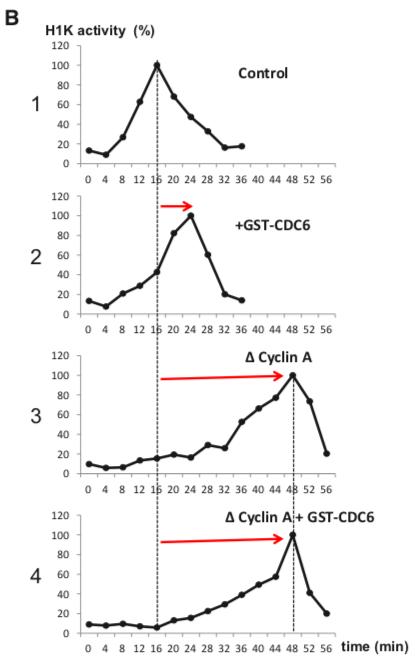 with GST-CDC6 (4; bottom. Red horizontal arrows point to the delay in the timing of the peak of histone H1 kinase activity in the experimental extracts (supplemented with CDC6 and/or depleted of cyclin A) in comparison to the timing in the control extract (the vertical dotted line).
