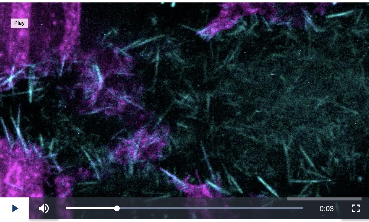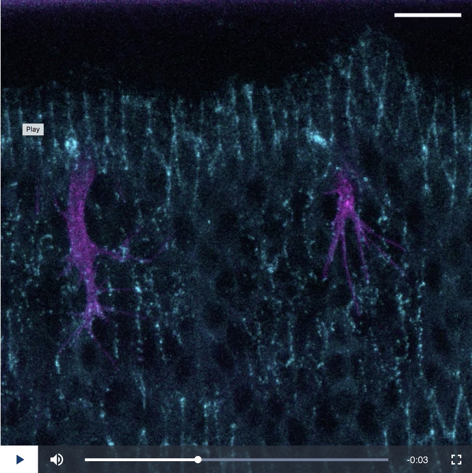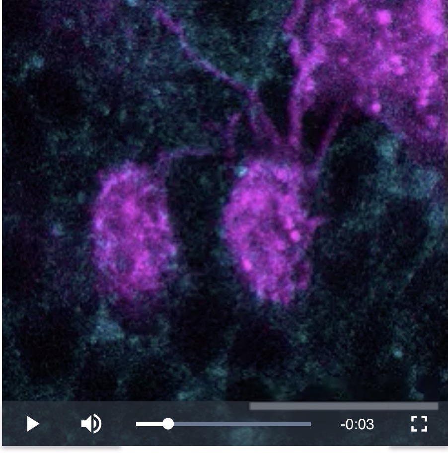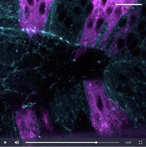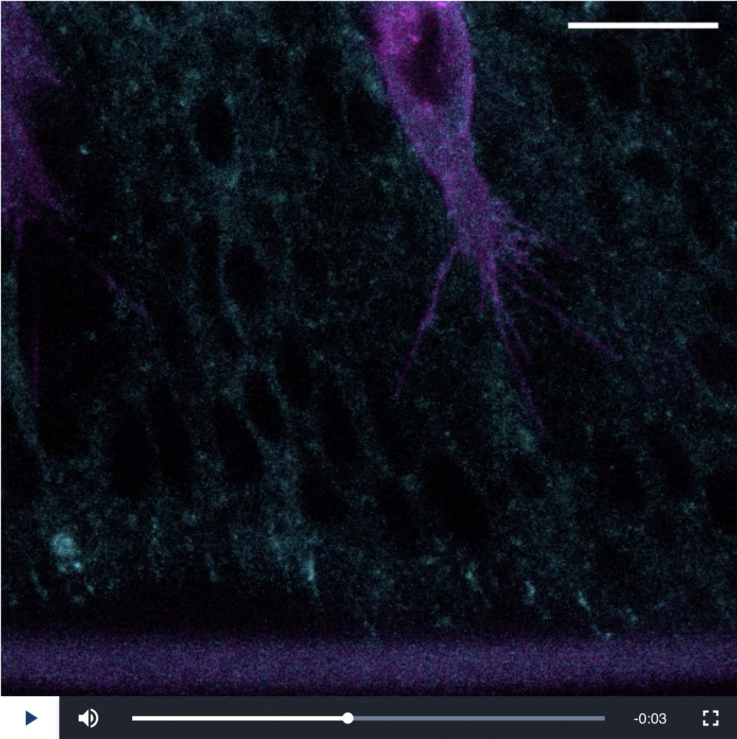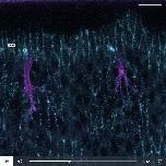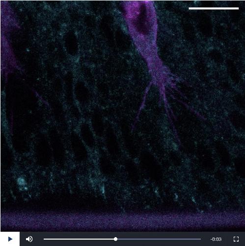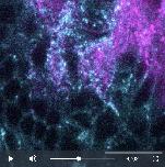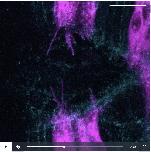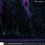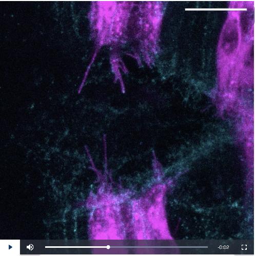Still from Video 3. Maximum-intensity projection of laser scanning confocal time-lapse z-stacks of enaGFP, btl-Gal4;UAS-cd8mCherry embryos, late stage 14. Representative video of of a total of 24 videos from 20 embryos. Scale bar represents 10 µm. Images were captured at 15-s intervals and are replayed at 10 frames per second. Ena is in cyan, membrane in magenta. |