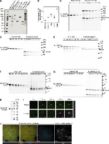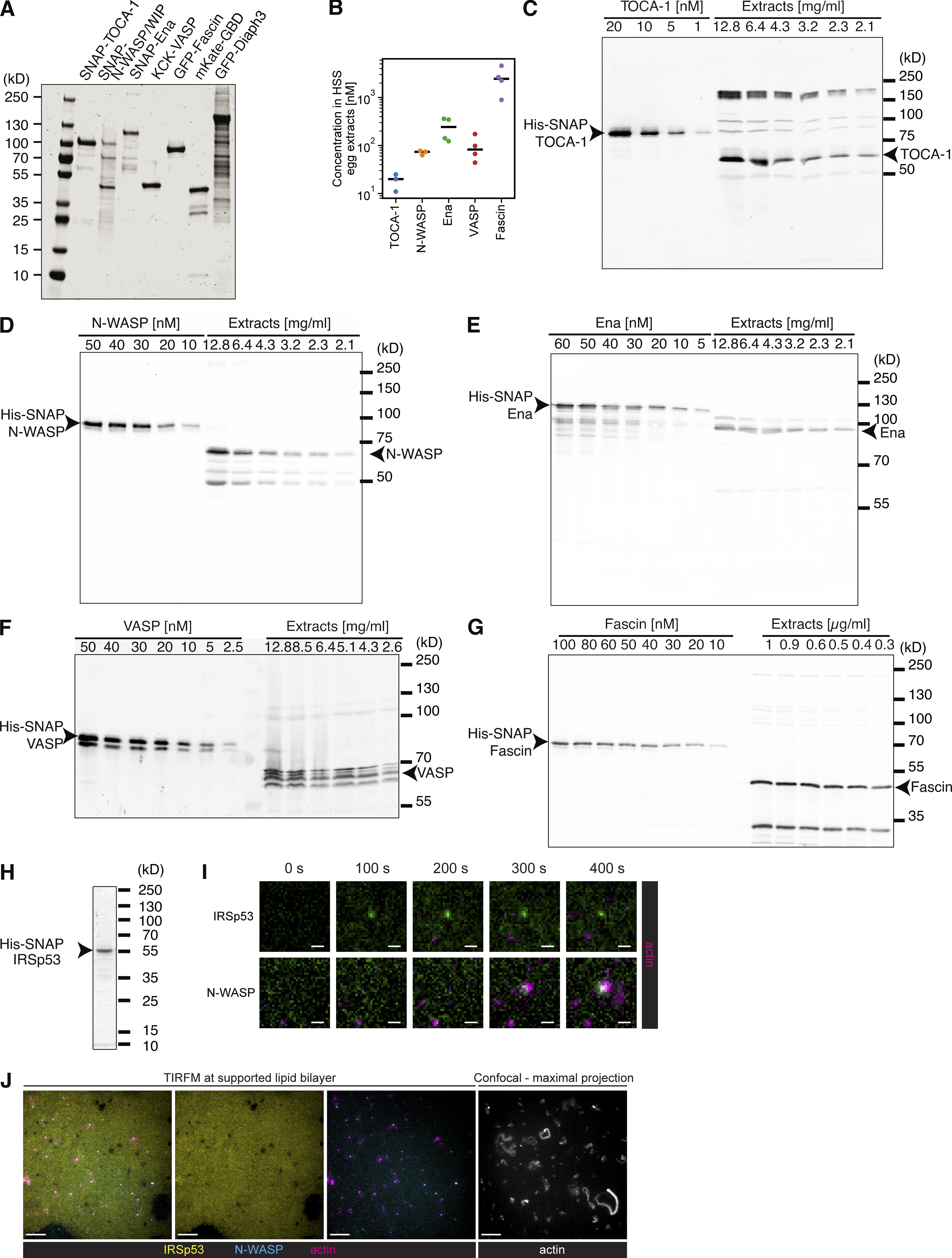 Figure S1. Purified protein gels and quantitative Western blots. (A) Coomassie staining of purified protein size separated via SDS-PAGE. (B) Quantification of three or four independent measurements for endogenous actin regulators within the HSS extracts. Black horizontal lines indicate the measurement mean. (CâG) Example blots of purified protein and X. laevis egg HSS extracts used to calculate concentration of proteins via quantitative Western blotting, probed as TOCA-1 (C), N-WASP (D), Ena (E), VASP (F; where we combined the bands suspecting they represented different phosphorylation states), and Fascin (G). (H) Purified IRSp53. (I) Time course showing that Alexa488-SNAP-IRSp53 foci do not localize to FLS actin bundles, whereas control N-WASP does (both added at 50 nM). Scale bars = 1 μm. (J) Alexa488-SNAP-IRSp53 binds the supported lipid bilayer. Scale bars = 10 μm. HSS, high-speed supernatant. TIRFM, total internal reflection fluorescence microscopy. |