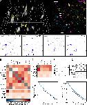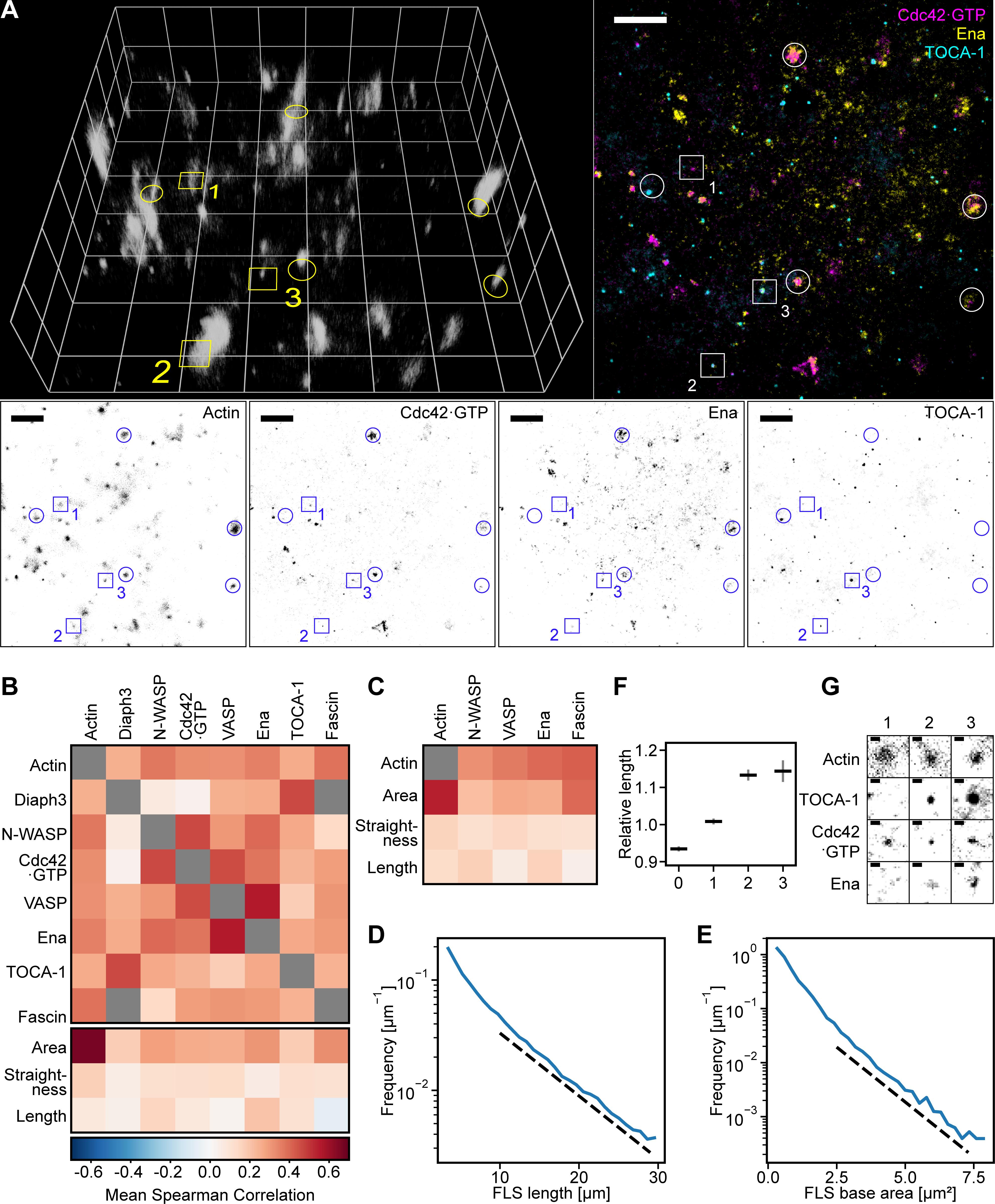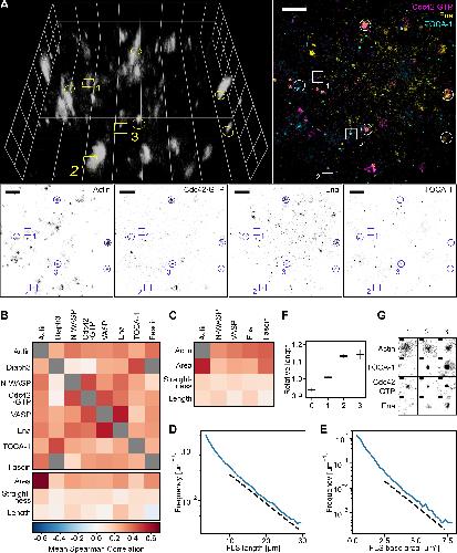 Figure 4. Actin regulators are heterogeneous, display redundancy, and exhibit preferred subcomplexes. (A) Complexes of diverse composition generate FLSs in vitro. Example of three different actin regulatory proteins (TOCA-1, Cdc42â¢GTP, and Ena) at the membrane together with a 3D reconstruction of the z-stack of the FLSs growing from a supported bilayer. Note the diversity of regulatory protein combinations observed under the FLSs (colored image in the top right, FLSs highlighted with circles throughout the panel). Grid spacing and scale bars = 10 µm. Volume-rendered FLSs are shown by setting each voxelâs transparency according to its measured intensity (lighter indicates higher intensity). Numbered squares indicate the positions of the example areas displayed in G. (B) Matrix showing Spearman proteinâprotein intensity correlation and morphologyâprotein intensity correlation values calculated separately per field of view and averaged. See Fig. S3 for FLS n numbers and Table 1 and Table 2 for numbers of experiments. Gray boxes mean exact correspondence (Diaph3 and Fascin are both enhanced GFP tagged). (C) Correlations of protein immunostaining intensity with actin intensity, FLS tip complex area, FLS straightness, and length are similar to the correlations from tagged protein experiments in Fig. 2 B. FLS numbers: Ena, n = 1,176; N-WASP, n = 1,971; VASP, n = 698; and Fascin, n = 877. (D) FLS lengths are approximately exponentially distributed. The dashed line is a guide for the eye and indicates an exponential with characteristic length L* = 7.6 µm. FLS count, n = 117,365. (E) FLS base areas are approximately exponentially distributed. The dashed line indicates an exponential with characteristic area A* = 1.07 µm2. FLS count, n = 117,365. (F) Relative change in FLS length for enriched FLS with zero, one, two, or three observed proteins compared with the total population length mean, calculated for each field of view and subsequently averaged. Error bars indicate the 95% confidence interval of the mean. Data were pooled from all the different combinations of proteins. Zero, n = 579; one, n = 577; two, n = 566; three, n = 376. (G) Closeups of individual tip complexes (from the numbered examples in A) showing cases where one, two, or all three proteins are enriched in an experiment containing labeled TOCA-1, Cdc42, and Ena. Scale bars = 1 µm. |