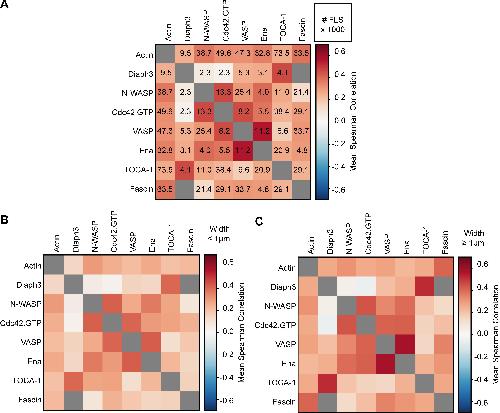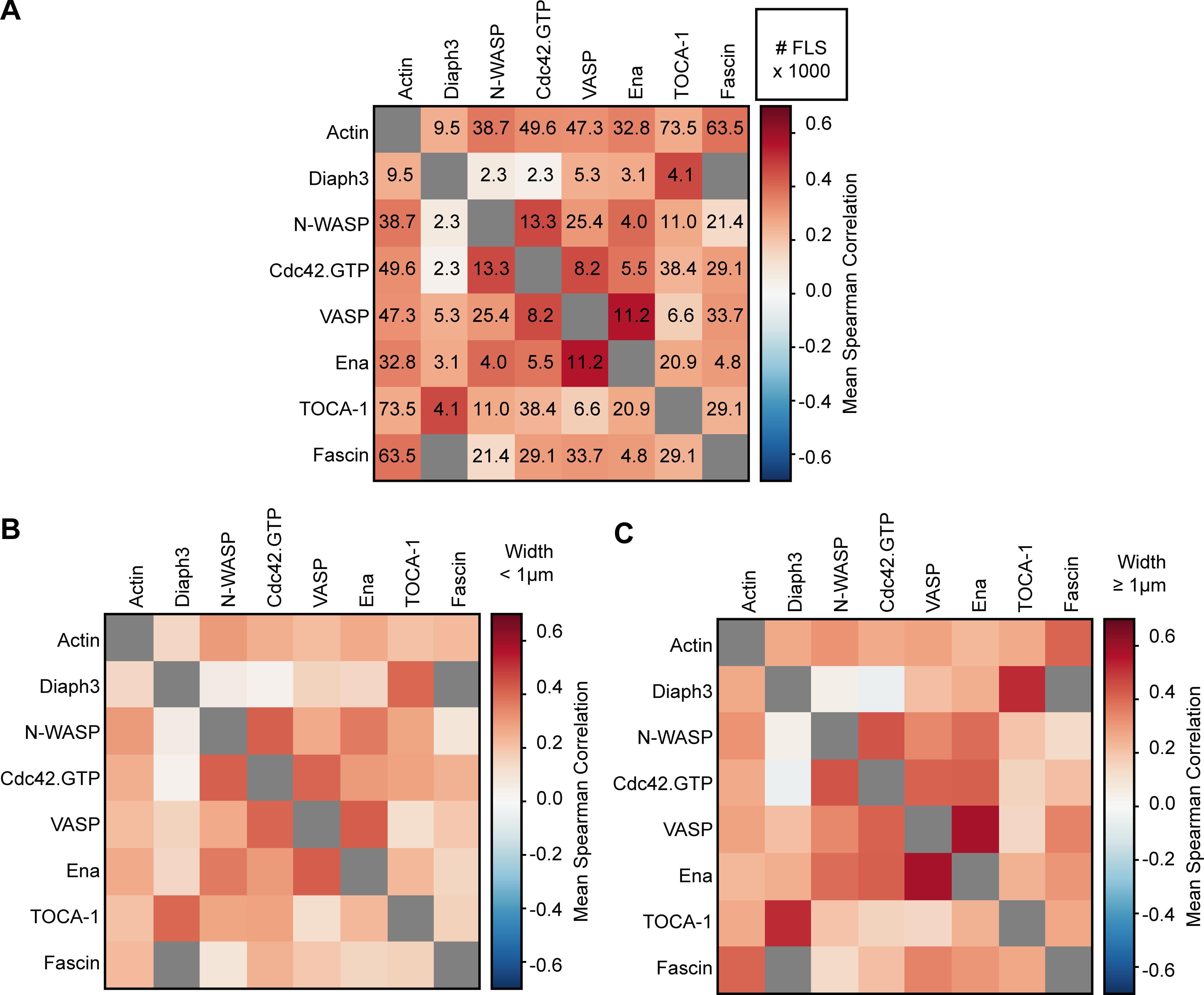 Figure S3. Positive correlations between actin regulators. (A) The correlation value matrix from Fig. 2 B with numbers of FLSs (lower right, in thousands). (B) Correlations between pairs of actin regulatory proteins for FLS tip complexes with an effective diameter below 1 μm. The color scale is the same as in Fig. 4 B. (C) Same as above for tip complexes with a diameter above 1 μm. The pattern of weak and stronger correlations is the same for both larger and smaller FLSs. |