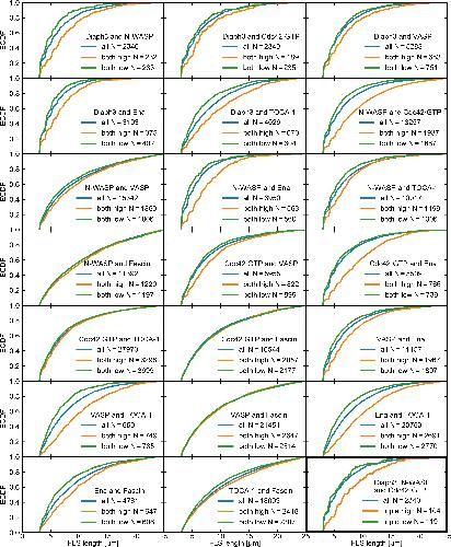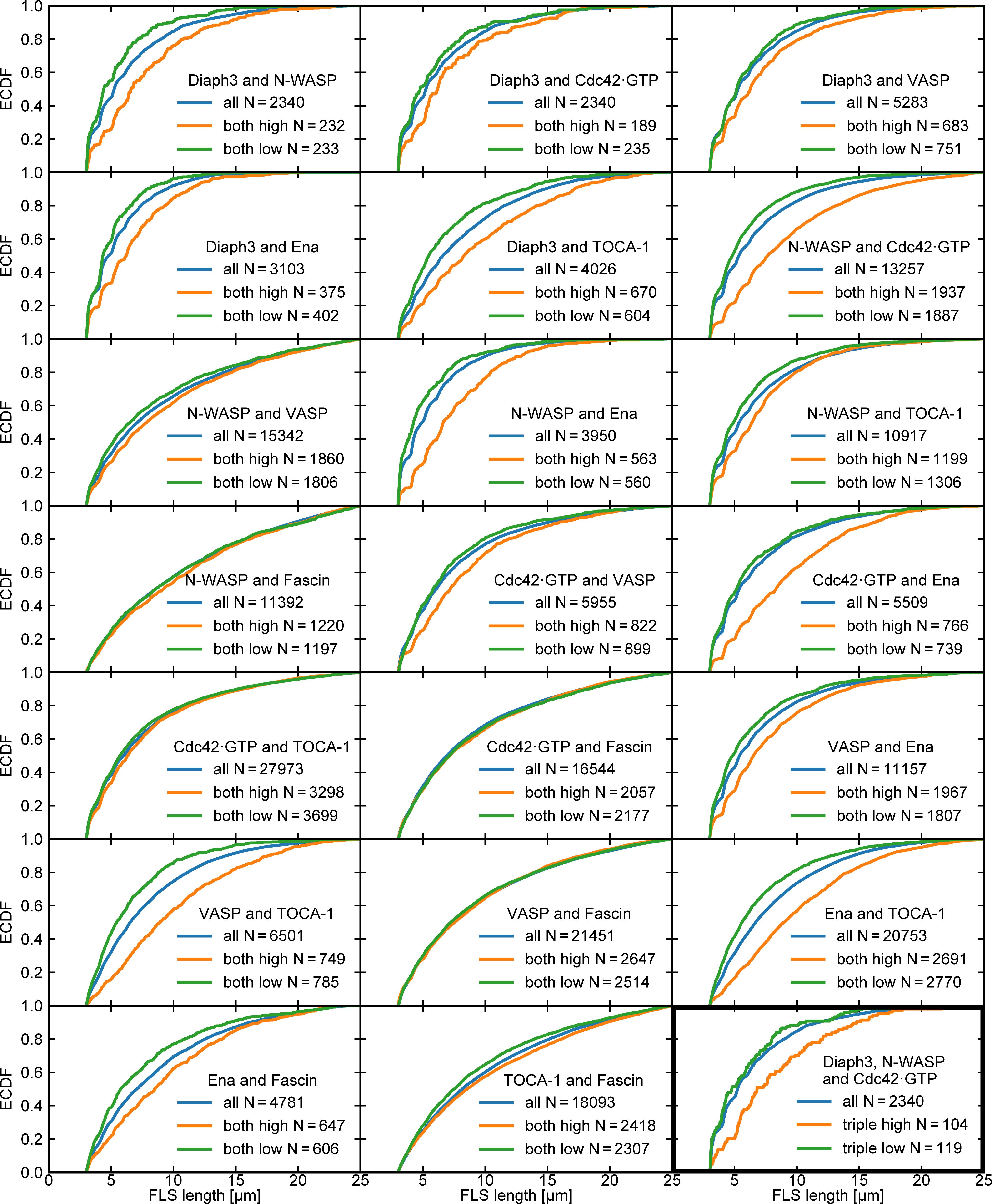 Figure S5. FLS lengths for different double combinations of proteins. Cumulative frequency plots (empirical cumulative distribution function, ECDF) of FLS length for all double combinations of regulatory proteins for the specific cohort (blue lines), both proteins enriched above a 70% intensity threshold (orange lines), and both proteins below the enrichment threshold (green lines). N values are given in the panel legends. All combinations enriched in Diaph3 and Ena are longer, together with some others. FLSs enriched in Fascin are usually no longer than those without, except when TOCA-1 is also enriched (compare green and orange lines). The triple combination of Diaph3/N-WASP/Cdc42â¢GTP shows similar effects (bottom right, black outline). Overall, length arises from multiple small, interacting effects. |