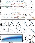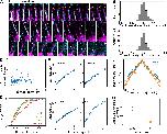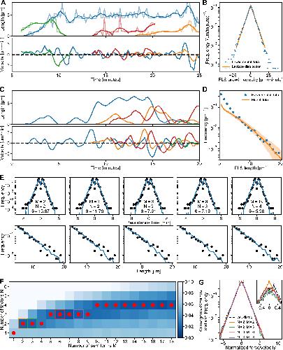 Figure 5. Mathematical framework for FLS growth captures experimental FLS length distribution and growth dynamics. (A) Four smoothed, different example experimental FLS length trajectories (top) and their instantaneous growth velocities (bottom) in different colors. (B) Histogram of measured FLS growth velocities (n = 114,816) from tracked FLS trajectories with maximum likelihood estimation fit of a bi-exponential Laplace distribution. (C) Four randomly selected smoothed example trajectories (top) generated from our sum-product framework with their instantaneous velocities (bottom). We started simulations at random initiation points at 0–20 min. (D) FLS length distribution (blue circles; n = 3,193 observations) and corresponding data from simulating 10,000 trajectories (solid orange line; shaded area is the 95% confidence interval of the histogram bin means). The simulation data histogram was scaled by the ratio between the median FLS lengths larger than 5 µm and the median simulated FLS lengths larger than 5 µm to visualize agreement between theory and experiment. (E) Predicted persistence time distribution (top row, blue solid lines) and length distributions (bottom row, blue solid lines) agree with the experimental distributions (black dots) for the different values of M and N in Fig. 3 E. Values for θ are given in min−1. Persistence time distribution n = 20,679. (F) Comparison of the experimental normalized growth velocity distributions to the simulations for different combinations of number of sum terms M and number of product factors N, using the Kolmogorov-Smirnov goodness-of-fit statistic. Darker blue indicates a better fit. The best fit N for any given M is highlighted by a red dot and follows an approximate square root dependence. Colored squares correspond to the data shown in G. (G) Force/velocity distributions (vel. distrib.) for the five combinations highlighted by colored squares in F. The dashed line is the normalized experimental growth velocity. The inset shows an enlargement of the peak of the distributions indicated by the dashed rectangle. The data used to generate the graphs is available in the Supplemental data. |