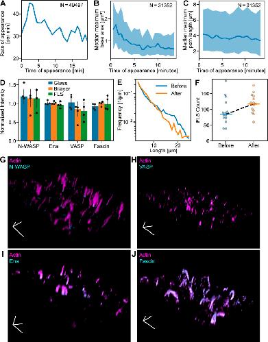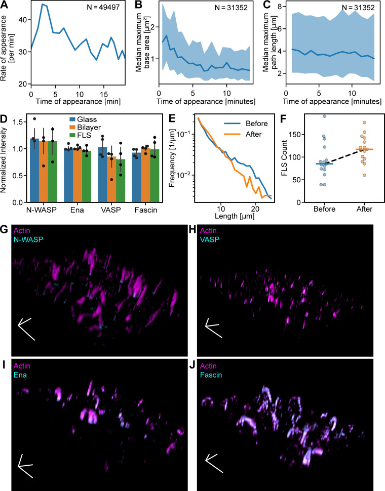 Figure S2. FLS appearance and morphology over time. (A) Rate of appearance of FLSs with time. (B) FLSs that arise early in the experiment end up slightly larger. (C) The lengths of FLSs that arise early and late are similar. Shaded areas in all graphs are the standard deviation. (D) Western blot quantification of N-WASP, Ena, VASP, and Fascin in FLS assay mix after incubation on coverslip glass surface, supported lipid bilayer, and after an FLS assay was performed for 20 min, normalized to the loading control (fluorescent actin) and to the protein intensity in the preincubation mix (n = 4 for each condition). Proteins were not appreciably depleted in any of the conditions. Error bars indicate SD. (E and F) FLS length distribution (E) and FLS count (F) from assays incubated for 20 min as usual (“Before”, n = 3,010) and by reusing the reaction mix from an assay to start another assay (“After”, n = 2,905). FLS length shows an approximate exponential distribution in both cases, and the numbers of FLSs were not reduced. Horizontal lines in F indicate the mean count. (G–J) Example images from FLS assays with actin (magenta) and immunostained N-WASP (G), VASP (H), Ena (I), and Fascin (J; all cyan). Scale tripod indicates 10 µm along each axis. |