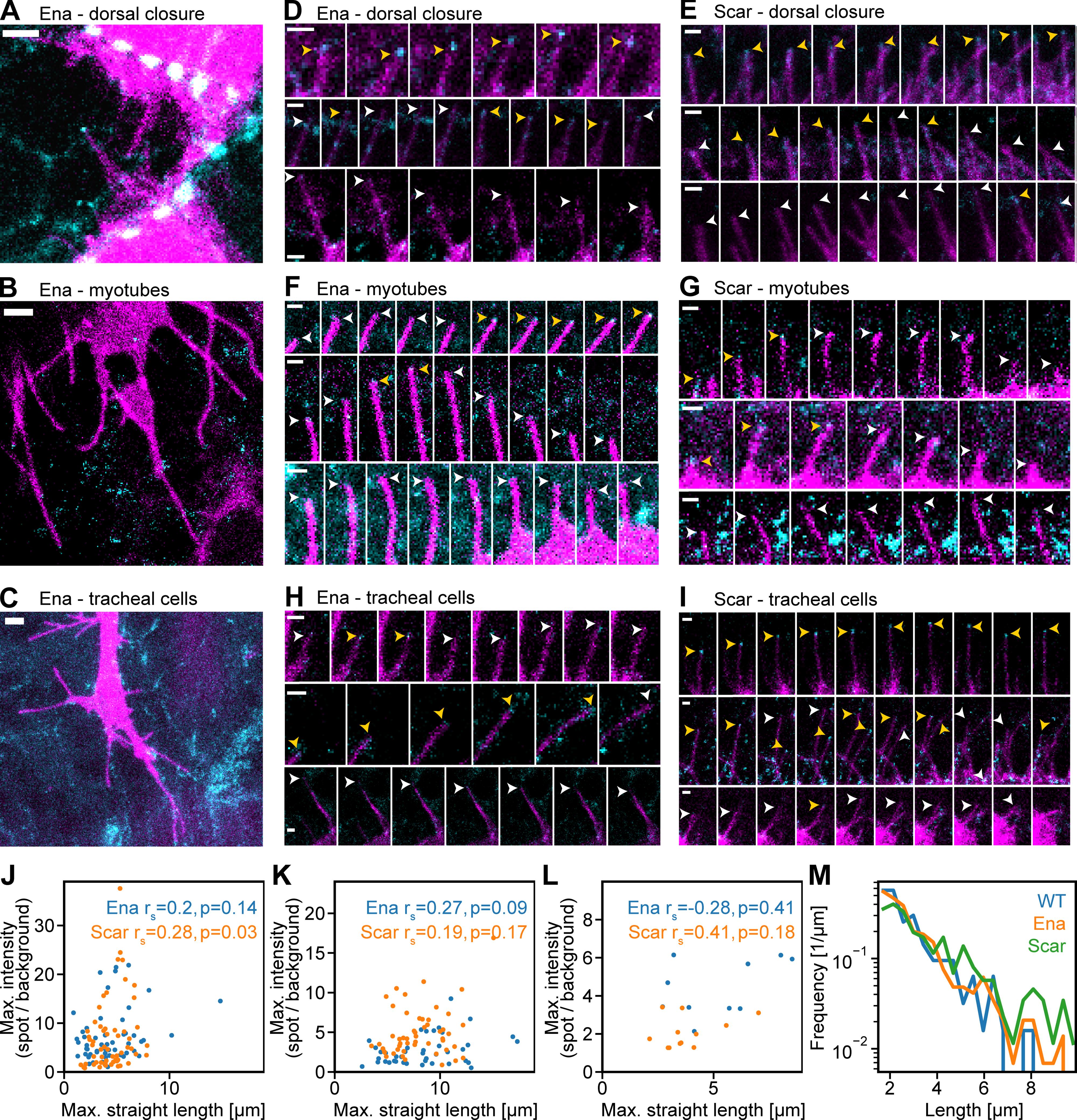 Figure 1. Heterogeneity in Ena and Scar at filopodium tips accompanies exponentially distributed filopodium lengths in vivo. (AâC) Varying intensities of Ena (cyan) at the tips of filopodia (membrane marker expressed using the Gal4 system shown in magenta) in leading edge cells in dorsal closure (A), myotubes (B), and tracheal cells (C) in the Drosophila embryo. Pictures are maximum-intensity projections of the cell marker together with the filopodium tip z-slice of the Ena channel. Scale bars = 2 μm. (D) Time-lapse montages every 15 s of filopodia in leading edge cells in dorsal closure in the Drosophila embryo with fluorescent Ena. Yellow and white arrowheads indicate filopodium tips with and without protein, respectively. Scale bar = 1 µm. (EâH) Similarly, Scar in dorsal closure (E), Ena in myotubes (F), Scar in myotubes (G), Ena in tracheal cells (H), and Scar in tracheal cells (I). (JâL) Scatter plot of maximal (Max.) Ena and Scar intensities at filopodium tips versus maximal end-to-end (straight) filopodia length, respectively, in dorsal closure (n = 53 and 58), tracheal cells (n = 42 and 51), and myotubes (n = 10 and 12). Spearman correlation coefficients and associated P values are shown. (M) Log plots of filopodium lengths from control (n = 150), GFP-Ena (n = 343), and mNeonGreen-Scar/WAVE (n = 213) knock-in homozygous flies are exponentially distributed and largely similar. |
