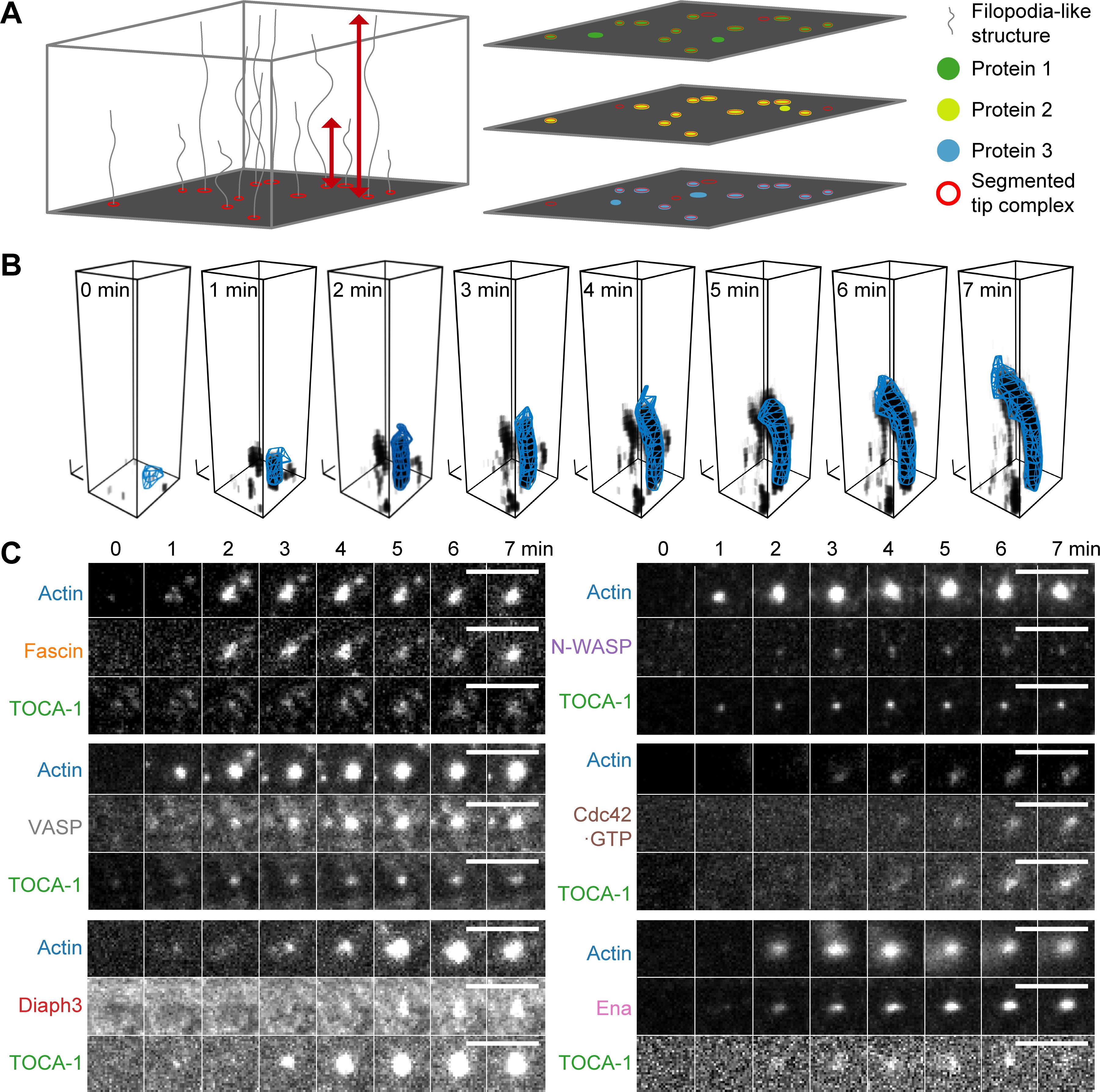 Figure 2. FLS growth and segmentation of actin bundles and tip complex assembly. (A) Images from HILO and confocal or wide-field illumination on the same fields of view. Individual FLSs are segmented based on the actin fluorescence from the z-stack. Red arrows indicate straight tip-to-end distance. A mask on the actin channel is used as an overlay on any other channel, measuring intensities inside the tip complex area defined at the membrane with background correction (at the base slice), and along the shaft. Output includes protein intensity information and shape parameters of the bundle. (B) Single example of bundle growth in time, together with its 3D reconstruction (blue mesh). Actin structures are shown by setting each voxelâs transparency according to its measured intensity (darker indicates higher intensity). The 3D reconstruction overlay uses the output of FLS Ace rendered using Blender software. Black scale tripods indicate 1 μm along each axis. (C) Time-lapse montages of six example FLS tip complexes showing the intensity increase of actin, TOCA-1, and another tip complex protein (scale bars = 5 µm). Protein concentrations labeled/unlabeled were Actin 210/14,000; TOCA-1 10/3; VASP 20/16; N-WASP 20/1; GBD 2/0; Fascin 300/416; Diaph3: 20/10; and Ena: 40/40 in nanomolars. |