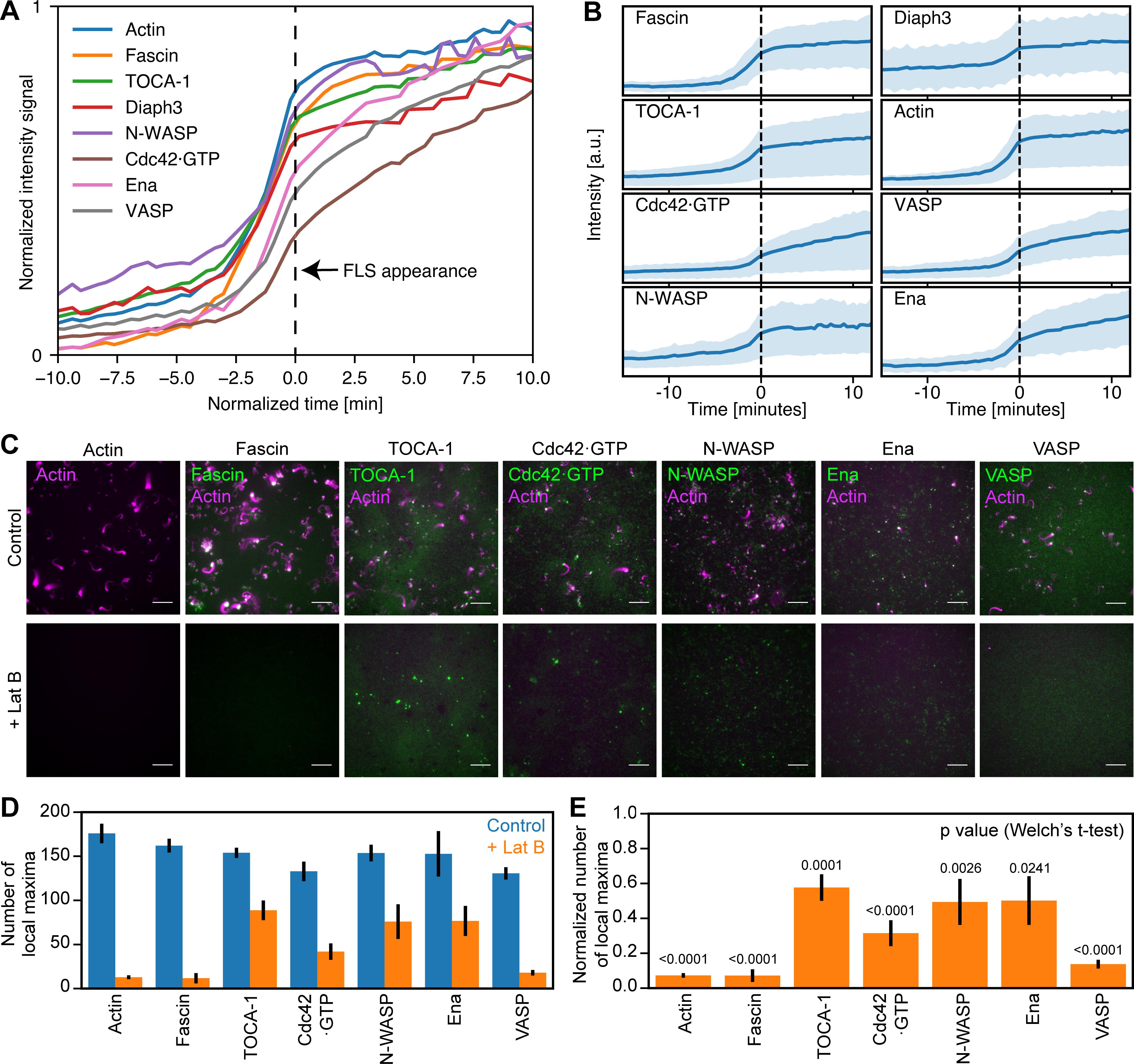 Figure 3. Actin regulatory proteins assemble cooperatively to polymerize actin bundles. (A) Mean intensity of accumulation in actin regulators over time as FLSs form combined from the experiments listed in Table 1: Actin n = 19,974; Fascin n = 2,898; TOCA-1 n = 19,893; Diaph3 n = 3,811; N-WASP = 1,743; Cdc42â¢GTP n = 7,839; Ena n = 1,828; and VASP n = 1,857. (B) Shaded area is the standard deviation of protein accumulation data from A. (C) LatB treatment reduces TOCA-1, Ena, and N-WASP foci on the membrane and inhibits recruitment of fascin and VASP, with partial inhibition of Cdc42â¢GTP localization. Scale bars = 10 µm. (D) Quantification of number of local maxima computed by protein fluorescence intensities plus and minus LatB. Error bars are the SEM. FLSs are from 8â15 fields of view of more than three independent experiments, and a normal distribution was assumed. (E). The fraction of local maxima when LatB was added normalized to the control. P values are from two-sided Welchâs t test. Error bars represent SEM. |