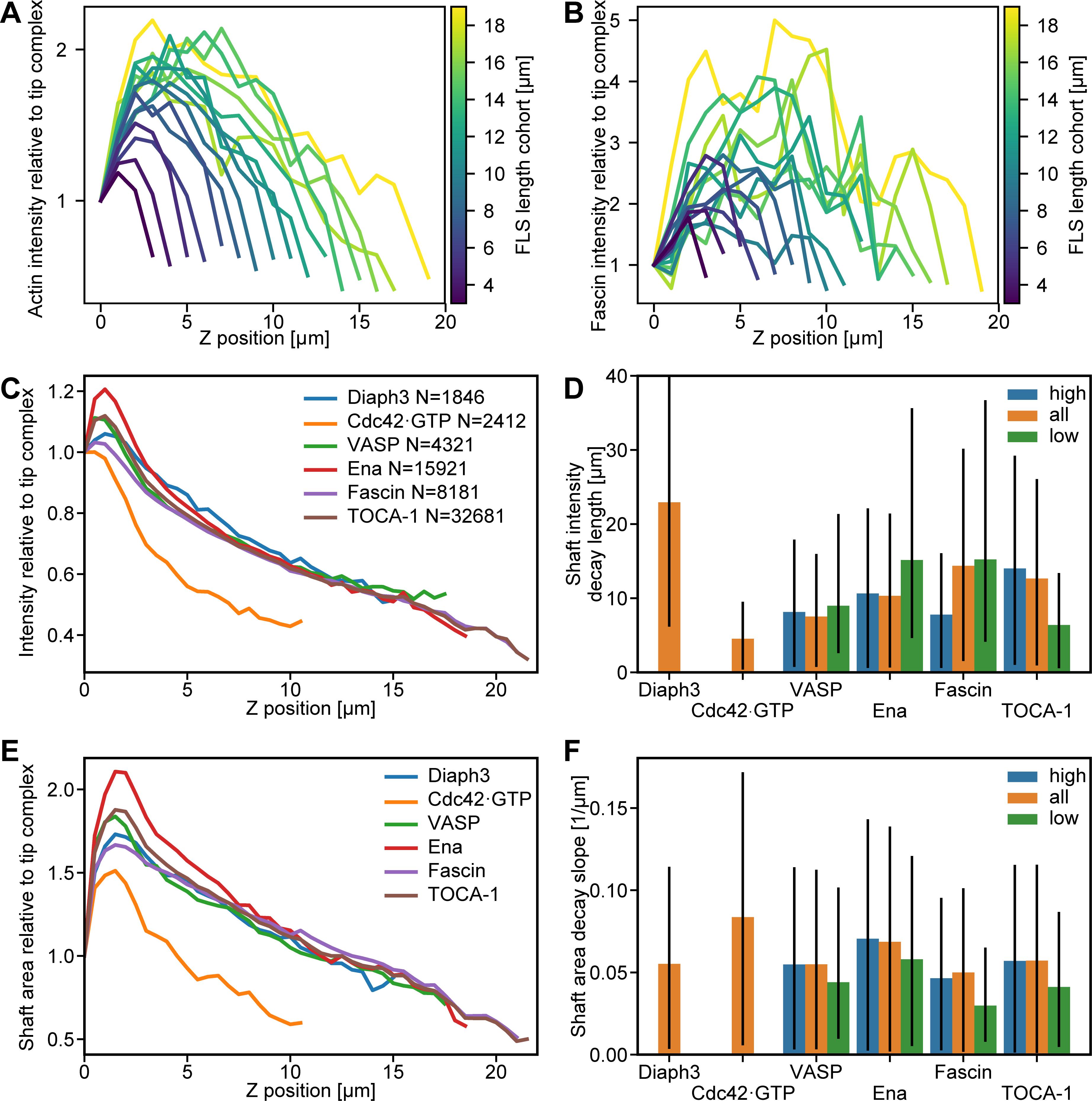Figure S4. The FLS shaft intensity is similar in all compositions. (A) Actin intensity along the shaft perpendicular to the x-y plane and relative to the intensity at the FLS tip complex for FLS cohorts (n = 1,818). The FLSs are categorized according to their lengths in 1-μm cohorts. (B) The same as in A for the fascin intensity along the shaft. (C) Median actin intensity along the shaft perpendicular to the x-y plane and relative to the intensity at the FLS tip complex from assays with the given proteins labeled (n numbers given in the legend). (D) Median actin intensity exponential decay length along the FLS shaft from fitting an exponential decay for a given protein enriched (high) or absent (low) compared with the whole set (all). Diaph3/all, n = 1,846; Cdc42·GTP/all, n = 2,312; VASP/all, n = 4,321; VASP/high, n = 1,297; VASP/low, n = 1,297; Ena/all, n = 15,921; Ena/high, n = 4,797; Ena/low, n = 4,793; Fascin/all, n = 8,181; Fascin/high, n = 2,463; Fascin/low, n = 2,461; TOCA-1/all, n = 32,581; TOCA-1/high, n = 9,813; and TOCA-1 low, n = 9,806. Error bars represent the 66% confidence interval obtained via resampled residuals bootstrap. Missing bars are due to fitting failures resulting from too small n numbers. (E) Median cross-sectional FLS area along the shaft from assays with different proteins labeled (n numbers given in C). (F) Median negative slope of actin width from linear decay fits for a given protein enriched (high, above 70th percentile) or absent (low, below 30th percentile) compared with the whole set (all). N numbers given for D. Error bars represent the 66% confidence interval obtained via resampled residuals bootstrap. |