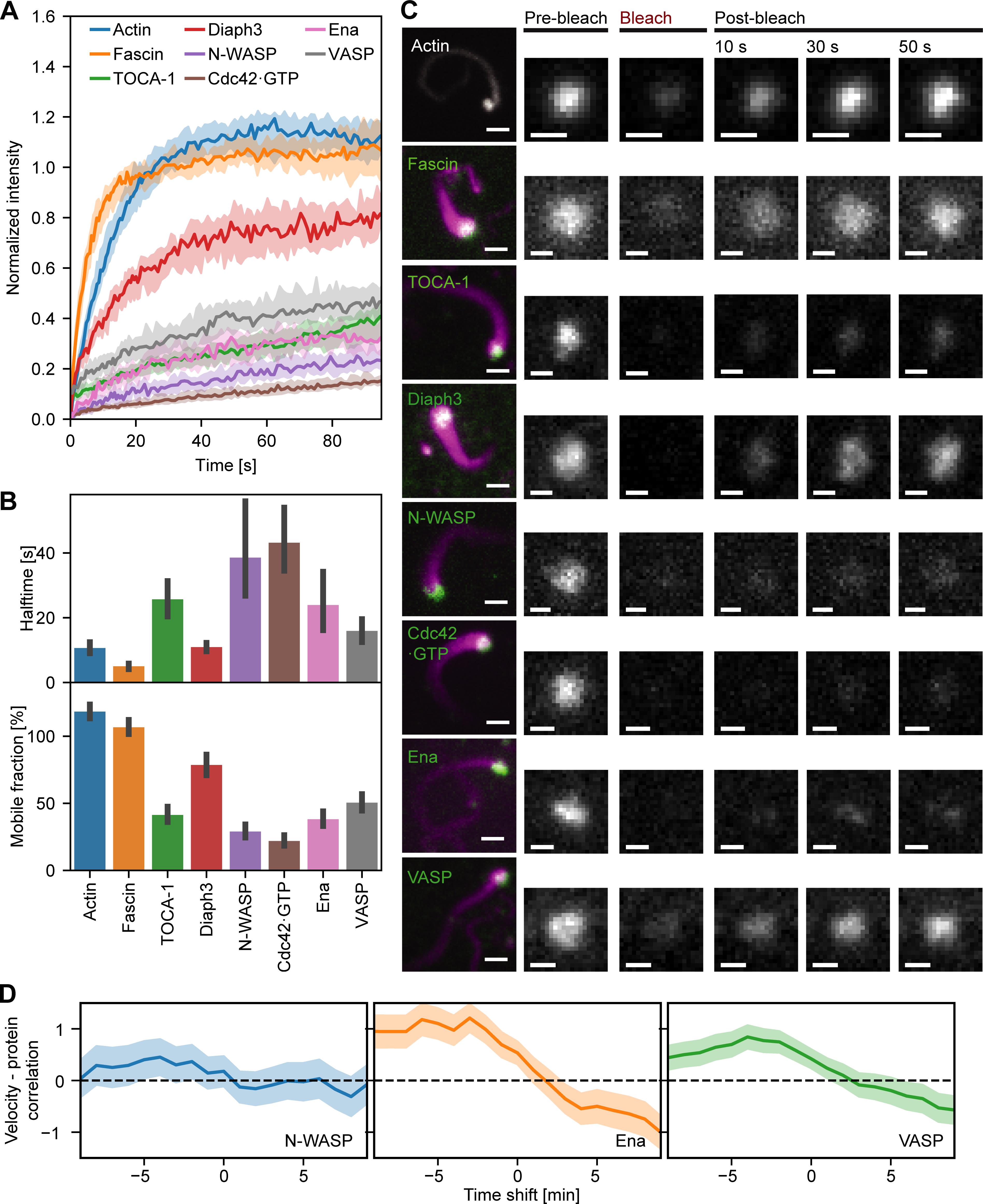 Figure 6. The FLS tip complex actin regulatory protein is semidynamic. (A) Time course recovery of AF488 actin (n = 65), GFP-Fascin (n = 40), AF488 TOCA-1(n = 51), GFP-Diaph3 (n = 34), AF488 N-WASP (n = 39), pmKate-GBD (n = 39), AF488 Ena (n = 36), and AF568 VASP (n = 51) after photobleaching in tips of FLSs at steady state grown for at least 30 min. Solid lines show the median, and the shaded area is the 95% confidence interval. (B) The half-time and percentage recovery from fitted exponential curves for each protein. Error bars represent the 95% confidence interval of the mean. (C) Actin regulatory protein localization to FLS and fluorescence recovery after photobleaching at FLS tips (green: protein of interest, magenta: AF647 actin). Protein concentrations unlabeled/labeled: Actin 210/4,000; TOCA-1 10/4; VASP 45/24; N-WASP 18/18; GBD 2.46/0; fascin 650/625; Diaph3 16/15; and Ena 60/60 in nanomolars. Scale bars = 2 µm (main images) or 1 µm (insets). (D) Time series cross-correlation of the absolute values of the FLS growth velocity and background-corrected N-WASP (n = 780), Ena (n = 2,003), and VASP (n = 2,783) intensities at FLS tip complexes, averaged over all measured FLS trajectories. The graph shows the cross-correlation coefficient at the given time shift (negative time shifts mean that intensity changes precede velocity changes). Shaded areas are 95% confidence interval of the mean. |