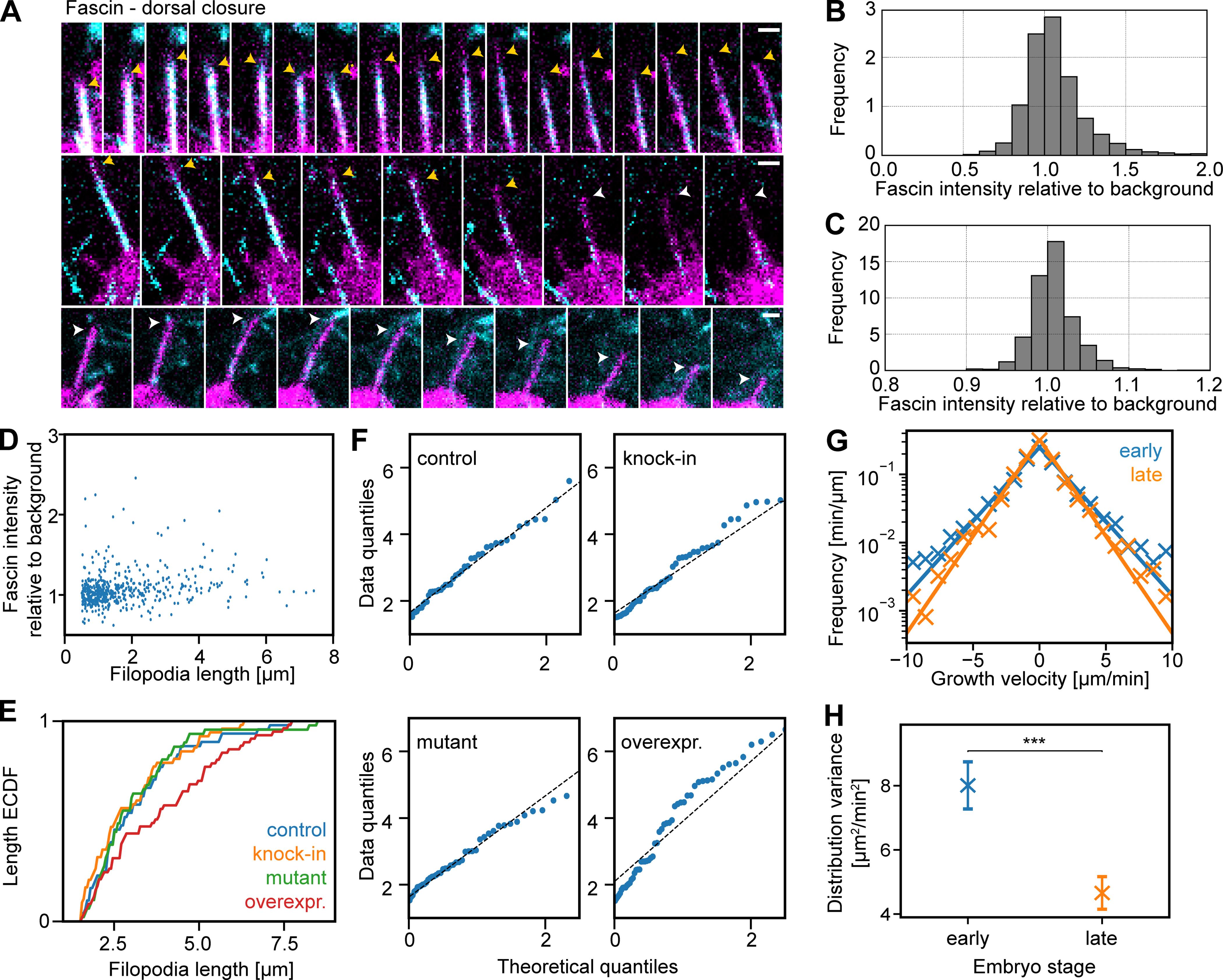 Figure 7. Heterogeneous levels of fascin and corresponding length distributions in vivo. (A) Time-lapse montages of maximum-intensity projections every 15 s of filopodia in leading edge cells in dorsal closure in the Drosophila embryo. Endogenous fluorescent Fascin is in cyan and membrane marker in magenta. Yellow and white arrowheads indicate filopodia with and without fascin. Scale bars = 1 µm. (B) Histogram of Fascin fluorescence intensity normalized to local background in filopodia, set to 1 (n = 3,432). (C) Histogram of Fascin fluorescence intensity normalized to local background in FLS shafts (n = 1,515). Most filopodia and FLSs only show background levels of fluorescence, with few at higher intensities. (D) Scatterplot of fascin intensity in filopodia shafts versus maximal filopodia length in leading edge cells in dorsal closure (n = 519). (E) Cumulative frequency plot (empirical cumulative distribution function, ECDF) of filopodia lengths with mutant (n = 47), wild-type (n = 48), knock-in GFP-Fascin (n = 53), and overexpressed (overexpr.) GFP-Fascin (n = 57) in dorsal closure leading edge filopodia. P values compared with control with two-sample Kolmogorov-Smirnov test: labeled Fascin, P = 0.765; mutant Fascin, P = 0.996; and Fascin overexpression, P = 0.047. (F) Q:Q plots show that control, labeled (knock-in) fascin, and mutant fascin filopodial lengths are consistent with an exponential distribution, but Fascin overexpression is not. (G) Lateral transverse myotube filopodial growth velocity distribution in stage 15 (early, n = 191) and stage 16 (late, n = 121). Crosses indicate experimentally derived data, and solid lines show maximum likelihood fits of a Laplace distribution. (H) Laplace distribution variances shown as crosses. Error bars indicate the 95% confidence intervals. The distributions for early and late stages are significantly different (***P = 0.00028, two-sample Kolmogorov-Smirnov test). Data are from four time-lapse movies each. Colors are the same as in G. |