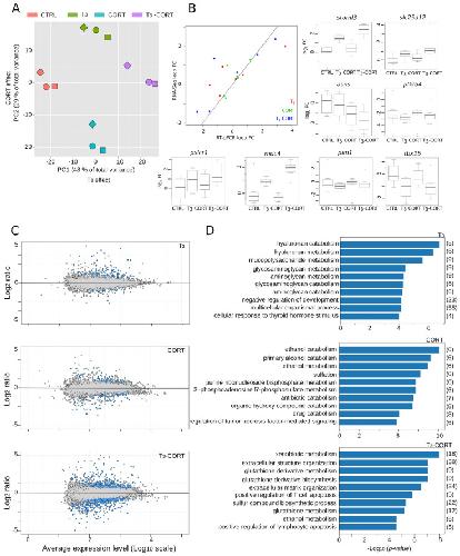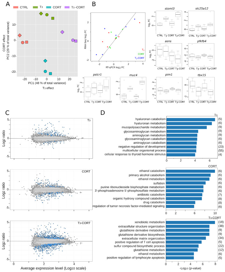 Figure 2. Transcriptome analysis following T3 and/or CORT. (A) Principal Component Analysis (PCA) of RNA-Seq variance from tailfin dissected from cultured tail explants. The two main components capture the effects of both hormones, corresponding to 77% of the total variance. Square, circle, and diamond: biological replicates. (B) Independent validation of RNA-Seq data by RT-qPCR. Scatter plot of the relationship between RNA-Seq versus RT-qPCR expression changes, also shown in box plots. (C) Average expression value versus fold change (MA plot). DE genes are in blue. (D) Gene Ontology analysis. |