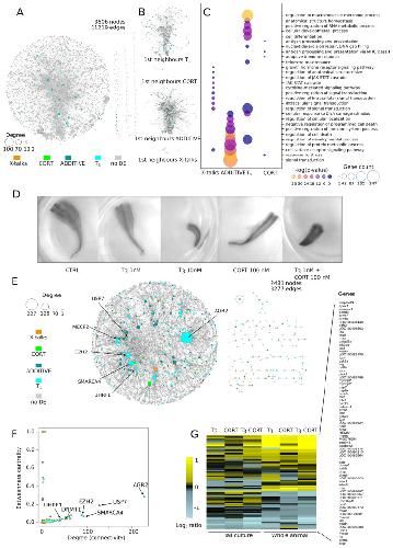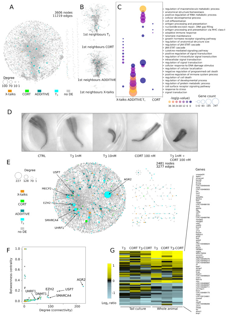 Figure 4. System level modeling of transcriptional responses identify the DNA methylation dynamic as a major mediator of tailfin regression. Only transcriptional responses displaying consistent expression between explants culture and whole animals are considered. (A) Network of KEGG pathways. (B) DE genes together with their first neighbors in the network, forming densely connected sub-networks. (C) GO analysis of the sub-networks highlighting terms such as cell death, DNA damages, and DNA repair. (D) Tail regression test in vitro. Synergistic action of T3 and CORT after 3 day treatments. (E,F) Protein-Protein Interactions network and identification of hubs. Most DE protein complexes relate to DNA methylation. (G) Heatmap of expression levels of genes involved in DNA methylation. |