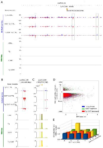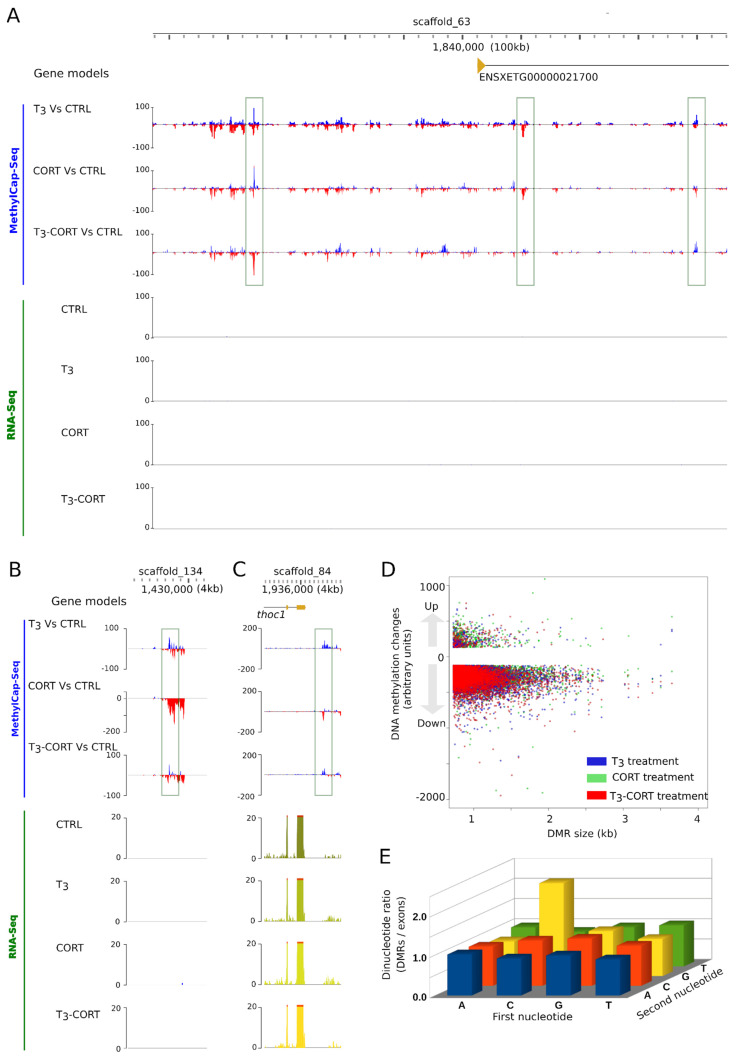 Figure 5. T3 and CORT induce genome wide changes of DNA methylation levels. (AâC) Three independent loci with local changes of DNA methylation (green arrow). Tracks order: gene annotation, DNA methylation changes relative to CTRL (T3, CORT, and T3-CORT), mRNA abundance (CTRL, T3, CORT, and T3-CORT). (D) Relationship between the genomic span and the amplitude of differentially methylated regions (DMR). (E) Differential dinucleotide frequency found in DMRs and exonic sequences. DMRs are enriched in CpG. |