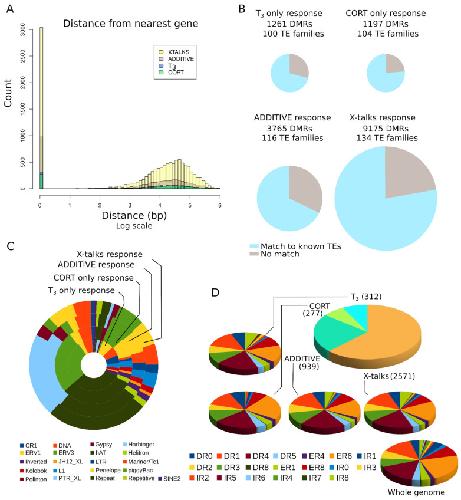 Figure 7. DMRs are located close to and far away from genes. (A) Distance between DMRs and the nearest gene. (B) Overlap between DMRs and known transposable element (TE) sequences. (C) TE content of DMRs. (D) Nuclear receptor binding sites predicted in DMRs. Only DMR containing predicted NRBS are shown. |
