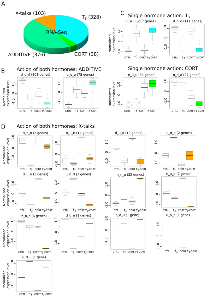 Figure 3. Gene expression is modulated by one, the other, or both hormones. Only genes displaying consistent expression between explants culture and whole animals were kept. (A) Types of gene regulation by T3 and CORT. (B) Gene regulation by either T3 or CORT. (C) Gene regulation by T3 and CORT. (D) Complex regulation by both hormones (X-talks). |
