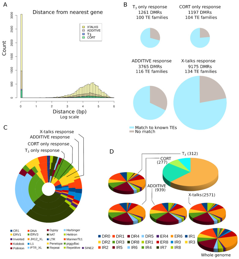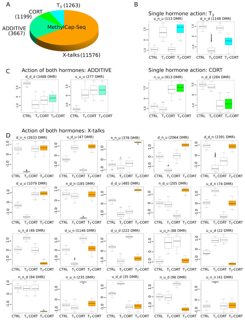 Figure 6. The complex dynamics of DNA methylation levels at DMRs. (A) Types of gene regulation by T3 and CORT. (B) Gene regulation by either T3 or CORT. (C) Gene regulation by T3 and CORT. (D) Complex regulation by both hormones (X-talks). |