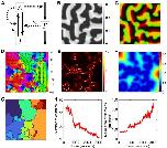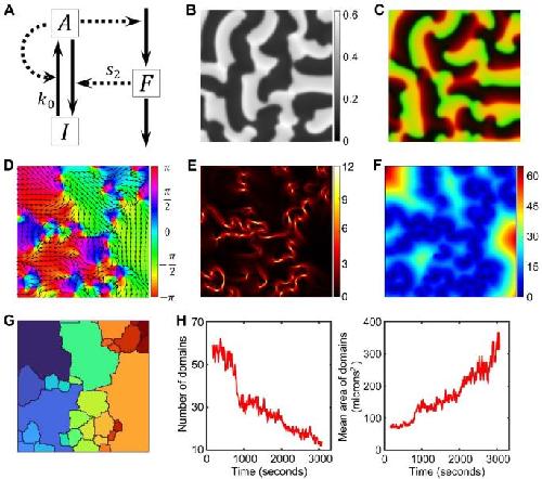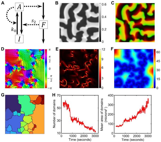 Figure 2. The model and an illustration of the wave domain concept. (A) Diagram of the signaling motif. 𝐴 and 𝐼 represent active and inactive forms of the signaling molecule, while 𝐹 represents a local inhibitor (see “Methods” for equations and Table 1 for parameter values). (B) The resulting distribution of component 𝐴 in a snapshot of the simulation with 𝑘0=0.15, 𝑠2=0.8 using homogeneous initial conditions. (C) An image of two merged channels: green channel represents activator 𝐴 and red channel represents inhibitor 𝐹. The concentrations were scaled as [𝐶−𝑚𝑖𝑛(𝐶)]/[max(𝐶)−𝑚𝑖𝑛(𝐶)]. (D) The colormap of the direction angles, 𝜃, of the wave vectors at the same time point as B and C. Arrows represent the direction of wave vectors. (E) The colormap of the magnitude of a local change (gradient) in the directions of the wave vectors. Regions of high gradient are located at the edges of wave domains. (F) The colormap of our metric of the coherence distance. (G) Segmentation of the coherence distance with the modified watershed algorithm and after merging domains with similar values of the mean 𝜃. (H) The dynamics of wave domains. The number of regions detected by the automated segmentation pipeline is decreasing (left panel), while the mean area of regions is increasing over time (right panel).
