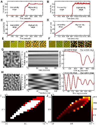 Figure 4. Two stages of pattern development and characteristics of the regimes in the low-activity stage. (A,B) The amplitude of the activator pattern, maxð¥,ð¦ð´âminð¥,ð¦ð´, during the low- and high-activity stages for the quasi-static low-activity regime (ð0=0.2, ð 2=0.8) and the oscillatory low-activity regime (ð0=0.2, ð 2=1.1), respectively. (C,D) The same plots as in (A), (B), but in the log scale. (E,F) A series of snapshots of the system behavior from the same parameters as in (A,C) and (B,D), respectively (see also Supplementary Videos S4âS6). The concentrations were scaled as [ð¶âminð¶]/[maxð¶âminð¶] both for the inhibitor (red channel) and the activator (green channel) before the channels were merged together. (G,H) (Left panels) Snapshots of the system in the quasi-static (ð0=0.2, ð 2=0.8) and oscillatory (ð0=0.2, ð 2=1.1) regimes of the low-activity stage; top and bottom panels respectively. (Central panels) Kymographs of the system dynamics along the vertical lines shown in the left panels. For comparison of patterns with different amplitude, the concentration values were scaled to zero mean and standard deviation equal to one (mean value was subtracted from each pixel and then divided by standard deviation). (Right panels) Temporal autocorrelation plots, showing the correlation coefficient as a function of the time lag (see âMethodsâ). (I) Classification of the parameter space with white and red colors indicating the quasi-static and oscillatory regimes, respectively. (J) Colormap showing the duration of the low-activity stage (in s).