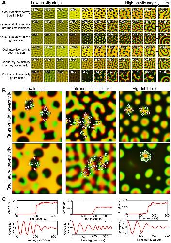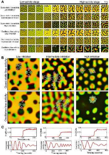 \begin{document}$${s}_{2}=1.1$$\end{document}s2=1.1 for oscillatory regimes). (B) Snapshots of the system at the beginning of the high-activity stage. Arrows indicate the direction of wave propagation. Dashed outlines indicate vector alignment on a larger scale. Images in (A), (B) show two merged channels: green for the activator and red for the inhibitor. (C) The activity amplitude and temporal autocorrelation for the oscillatory low-activity stage with weak negative feedback (left), balanced activation and inhibition (center), and strong negative feedback (right).