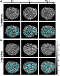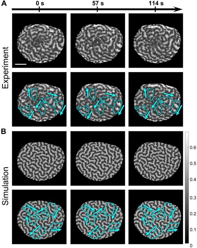 Figure 1. Cortical waves of Rho activity in Patiria miniata oocytes. Here oocytes have overexpressed Rho-GEF Ect2, induced expression of â90 cyclin B, and are treated with roscovitine. Both the experiment31 and our model show similar overall dynamics and the presence of wave domains. (A) Snapshots of wave propagation in the experiment. The images are generated from the data published in Bement et al.31 with the permission of the authors. The scale bar is 50 μm. (B) Snapshots of wave propagation in our simulation (ð0=0.2, ð 2=1, ð¼1=3, ð¼2=0.1). The cyan contours outline wave domains as defined in the following section, while the arrows indicate the direction of wave propagation in these domains. For the full dynamics see Supplementary Video 16 in Ref.31 and our Supplementary Video S1.