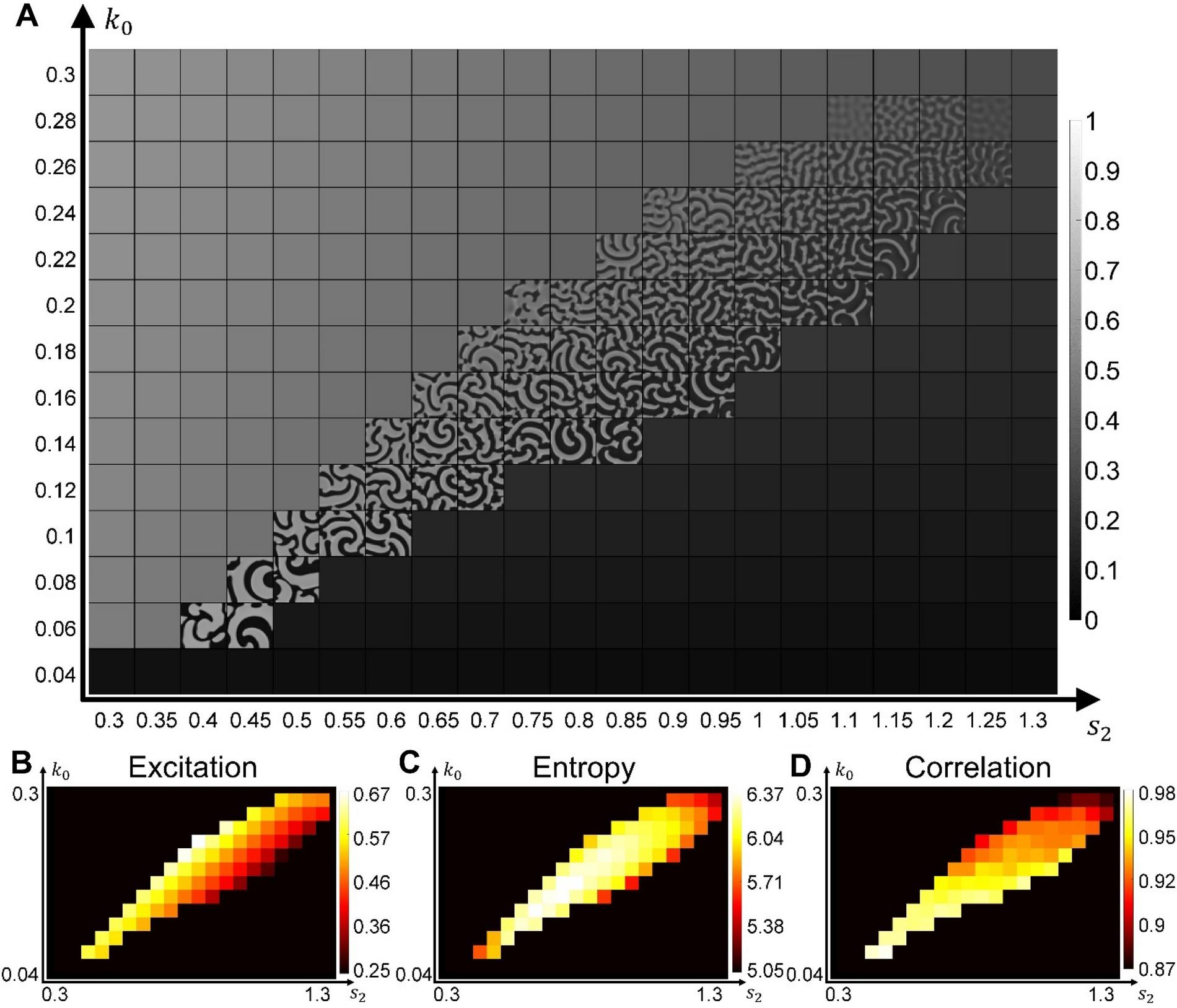 Figure 3. Parameter scan and textural analysis of the emerging patterns. (A) The result of model simulations for a range of parameters 𝑘0 and 𝑠2 (see also Supplementary Video S3). (B) The colormap of the excitation measure (see “Methods”) for the parameter space in (A). (C, D) The textural measures of pattern entropy and correlation for the parameter space in (A). Each measure was averaged over 100 simulation steps after the formation of waves from the initial homogeneous state.