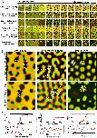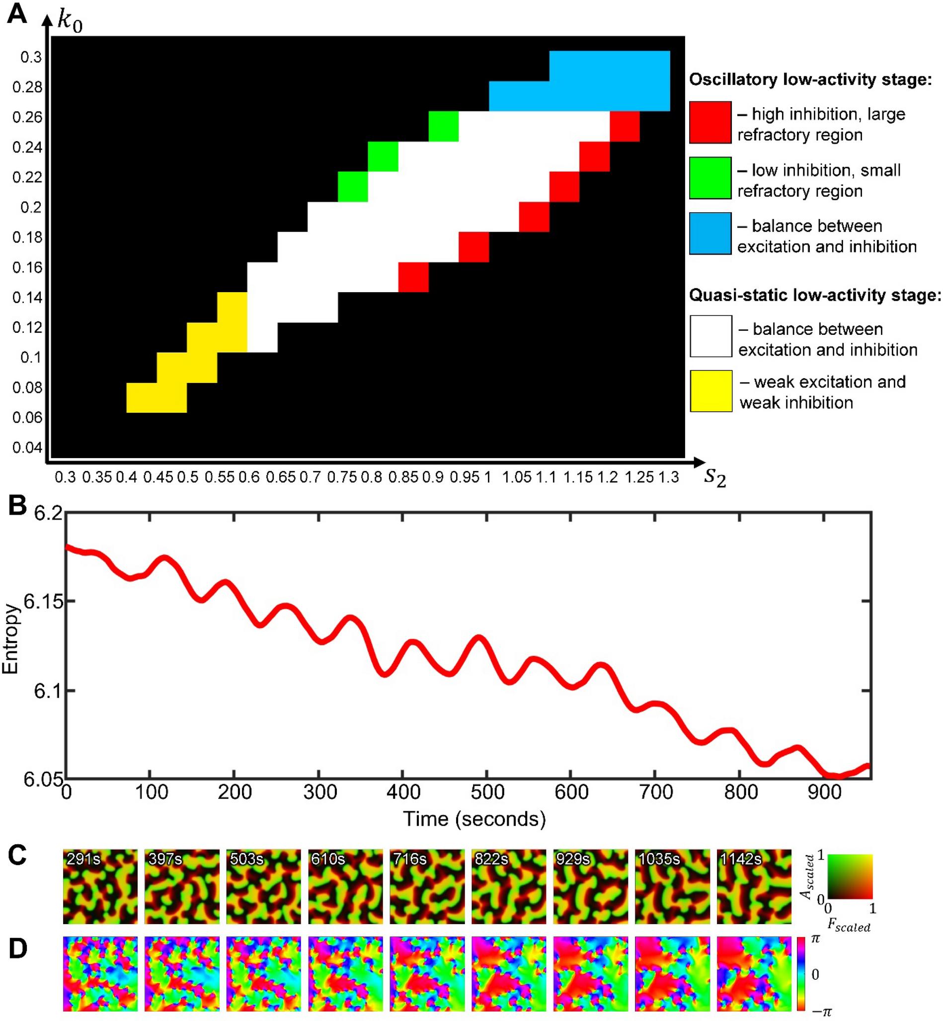 Figure 6. Classification and long-term dynamics of wave domains. (A) Different types of system’s behaviors in the space of parameters representing the basal activation rate and the strength of negative feedback. (B) Textural entropy as a function of time during the growth of wave domains (𝑘0=0.15, 𝑠2=0.8). (C) Snapshots from the simulation in B with the simultaneous visualization of the inhibitor and activator in the system (merged channels). (D) Colormaps of the direction of wave propagation in (C) showing the increasing size and decreasing number of the wave domains over time. The values of wave vector angles were averaged with a running window of 83 s.