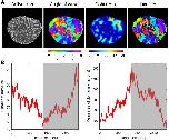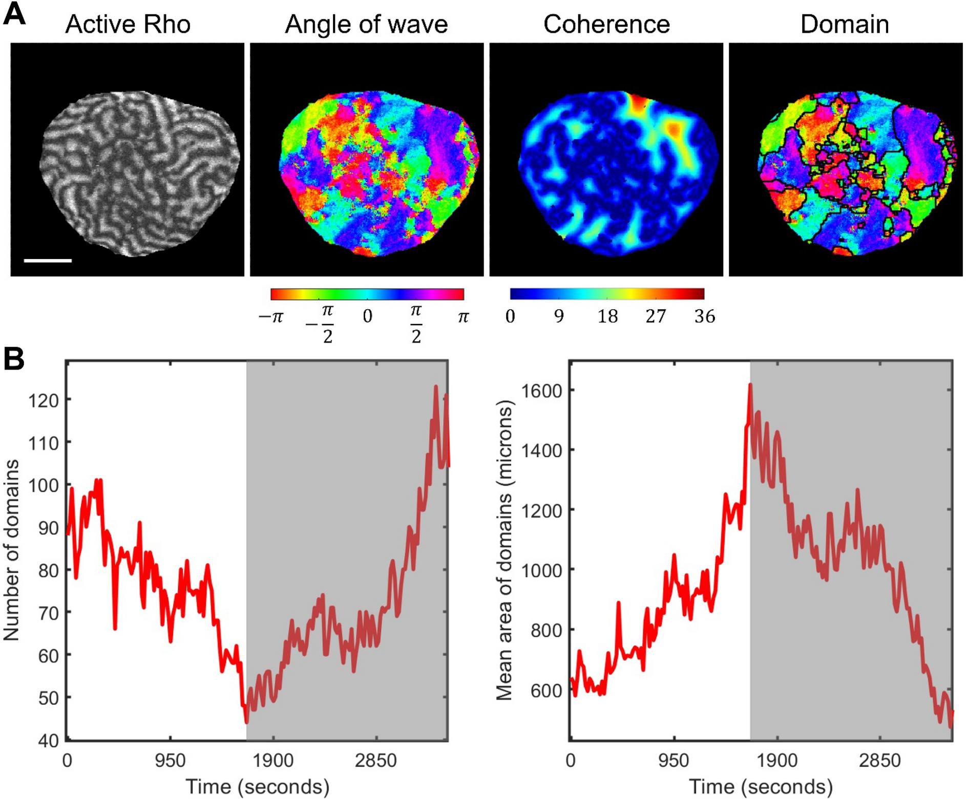 Figure 7. Wave domains analysis for experimental starfish data. (A) The pipeline of wave domain identification in starfish experimental images, including active Rho pattern, colormap of wave vector directions, colormap of the coherence distance, and wave domain segmentation. The scale bar is 50 μm. The image in the left panel is generated from the data published in Bement et al.31 with the permission of the authors. (B) The mean size of wave domains as a function of time for starfish oocyte. The grey area indicates the period of time after the sharp switch in the cell behavior.