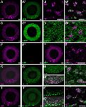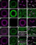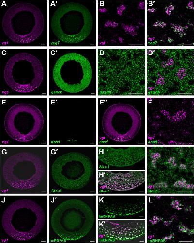 FIGURE 1: Vegetally localizing mRNA is contained in a large RNP complex. (A) A cryosection of a stage II oocyte probed by FISH for vg1 mRNA (magenta) and vegT mRNA (Aâ², green) is shown, with the vegetal cortex at the bottom. Scale bar = 50 µm. (B) Higher magnification view of the vegetal cytoplasm of a stage II oocyte probed by FISH for vg1 mRNA (magenta), shown merged in Bâ² with vegT mRNA (green). Scale bar = 10 µm. (C) A cryosection of a stage II oocyte probed by FISH for vg1 mRNA (magenta) and gapdh mRNA (Câ², green) is shown, with the vegetal cortex at the bottom. Scale bar = 50 µm. (D) Higher magnification view of gapdh mRNA in the vegetal cytoplasm of a stage II oocyte probed by FISH for gapdh mRNA (green), shown merged in Dâ² with vg1 mRNA (magenta). Scale bar = 10 µm. (E) A cryosection of a stage II oocyte probed by FISH for vg1 mRNA (magenta) nos1 mRNA (Eâ², green), and merged in Eâ²â² is shown. The vegetal cortex is at the bottom. Scale bar = 50 µm. (F) Higher magnification view of nos1 mRNA (green) and vg1 mRNA (magenta) in the vegetal cytoplasm of a stage II oocyte. The vegetal cortex is at the bottom; scale bar = 10 µm. (G) A cryosection of a stage II oocyte is shown, with the vegetal cortex at the bottom. Combined FISH-IF was used to detect vg1 mRNA (magenta) and Stau1 protein (Gâ², green). Scale bar = 50 µm. (H) Combined FISH-IF was used to detect Stau1 (H, green) in the vegetal cytoplasm of a stage II oocyte, merged with vg1 mRNA (magenta) in Hâ². Scale bar = 20 µm. (I) High magnification view of the vegetal cytoplasm of a stage II oocyte showing colocalization of vg1 mRNA (magenta) and Stau1 protein (green). Scale bar = 10 µm. (J) A cryosection of a stage II oocyte is shown with the vegetal cortex at the bottom. Combined FISH-IF was used to detect vg1 mRNA (magenta) and hnRNPAB protein (Jâ², green). Scale bar = 50 µm. (K) Combined FISH-IF was used to detect hnRNPAB (K, green) in the vegetal cytoplasm of a stage II oocyte, merged with vg1 mRNA (magenta) in Kâ². Scale bar = 20 µm. (L) High magnification view of the vegetal cytoplasm of a stage II oocyte showing colocalization of vg1 mRNA (magenta) and hnRNPAB protein (green). Scale bar = 10 µm. |