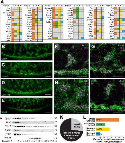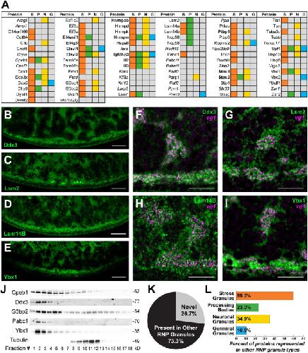 FIGURE 4: L-bodies contain protein components common to other classes of cytoplasmic RNP granules. (A) Protein constituents of L-bodies are also found in stress granules (S, orange), P-bodies (P, green), neuronal granules (N, yellow), and germ granules (G, blue). Proteins found in L-bodies but not reported in other granules, are italicized and previously known vg1 RBPs are bolded. (BâI) IF and combined FISH-IF were performed to validate potential protein constituents of L-bodies. (B, C) Shown are IF images of stage II oocytes using (B) anti-Ddx3, (C) anti-Lsm2, (D) anti-Lsm14B, and (E) anti-Ybx1. The vegetal cortex is at the bottom; scale bars = 20 µm. (FâI) Shown are FISH-IF images of the vegetal cytoplasm of stage II oocytes with the vegetal cortex at the bottom; scale bars = 10 µm. Shown in magenta is vg1 mRNA detected by FISH. Merged in green is IF using (F) anti-Ddx3, (G) anti-Lsm2, (H) anti-Lsm14B, and (I) anti-Ybx1. See also Supplemental Table S5. (J) Immunoblot analysis is shown of SE column fractions probed using anti-Cpeb1, anti-Ddx3, anti-G3bp2, anti-Pabc1, anti-Ybx1, and anti-Tubulin antibodies. The fraction numbers are indicated at the bottom. (K) Overlap (black, 73.3%) of L-body constituents with other cytoplasmic granules; unique proteins are indicated by gray (26.7%). (L) The percentage of identified L-body proteins that are found in other cytoplasmic RNP granule types: stress granules (59.3%, 51 of 86), P-bodies (23.3%, 20 of 86), neuronal granules (34.9%, 30 of 86), and germinal granules (10.5%, 9 of 86). See also Supplemental Table S7. |
