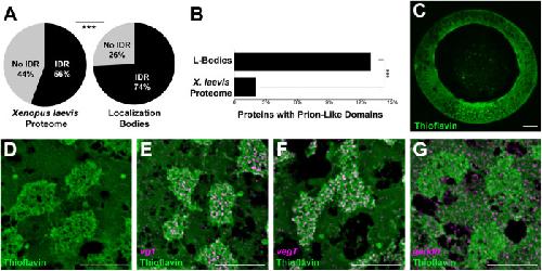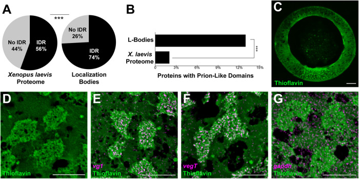 FIGURE 5: L-bodies exhibit a meshlike structure. (A) Comparison by SLIDER analysis (Peng et al., 2014 blue right-pointing triangle) for long IDRs (>30 consecutively disordered residues) for the X. laevis proteome vs. the L-body proteome. ***p < 0.001. (B) The percentage of prionlike domains in the L-body proteome was compared with the Xenopus proteome using PLAAC. Prionlike domains are sixfold enriched in L-bodies (12.9%) relative to the Xenopus proteome (2.02%). ***p < 0.001. (C) A stage II oocyte stained with thioflavin is shown, with the vegetal cortex at the bottom. Scale bar = 50 µm. (D) High magnification view of the vegetal cytoplasm of a stage II oocyte stained with thioflavin. Scale bar = 10 µm. (EâG) High magnification views of the vegetal cytoplasm of stage II oocytes stained with thioflavin are shown; scale bars = 10 µm. Thioflavin staining (green) was combined with FISH (magenta) for detection of the following RNAs: (E) vg1, (F) vegT, and (G) gapdh. |