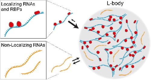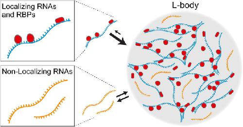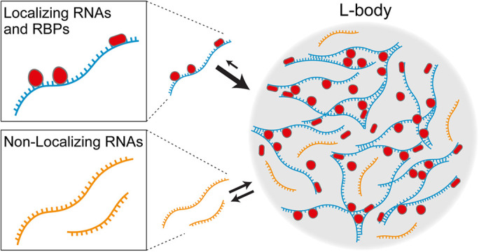 FIGURE 7: Model for L-body structure and assembly. Localizing RNAs (blue) interact with specific RNA-binding proteins (RBPs; red) that facilitate local enrichment. Nonlocalizing RNAs (gold) lack binding sites for these RBPs and do not condense with other localized RNAs. Specific RBPs facilitate enrichment (large arrows) of localized RNAs in L-bodies (gray). L-body enrichment results in high local RNA concentrations, facilitating RNA–RNA, RNA–protein, and protein–protein interactions and formation of a nondynamic RNA phase enmeshed in a more dynamic protein phase. Nonlocalized RNAs (and proteins) are not excluded from L-bodies, and can freely move in and out (double arrows). |