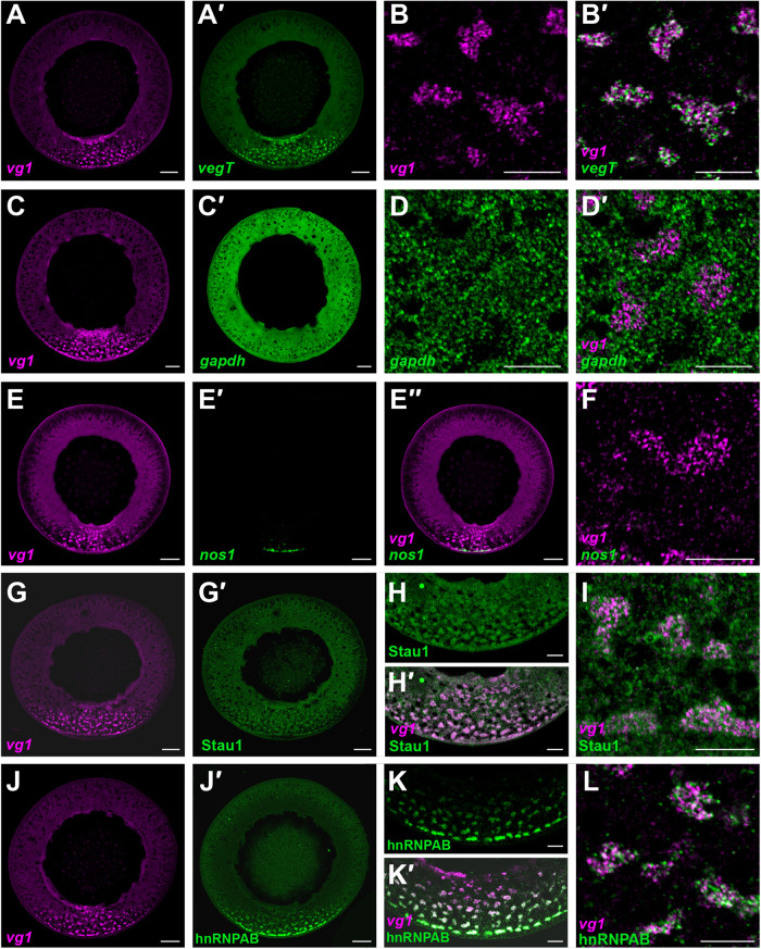 FIGURE 1:. Vegetally localizing mRNA is contained in a large RNP complex. (A) A cryosection of a stage II oocyte probed by FISH for vg1 mRNA (magenta) and vegT mRNA (A′, green) is shown, with the vegetal cortex at the bottom. Scale bar = 50 µm. (B) Higher magnification view of the vegetal cytoplasm of a stage II oocyte probed by FISH for vg1 mRNA (magenta), shown merged in B′ with vegT mRNA (green). Scale bar = 10 µm. (C) A cryosection of a stage II oocyte probed by FISH for vg1 mRNA (magenta) and gapdh mRNA (C′, green) is shown, with the vegetal cortex at the bottom. Scale bar = 50 µm. (D) Higher magnification view of gapdh mRNA in the vegetal cytoplasm of a stage II oocyte probed by FISH for gapdh mRNA (green), shown merged in D′ with vg1 mRNA (magenta). Scale bar = 10 µm. (E) A cryosection of a stage II oocyte probed by FISH for vg1 mRNA (magenta) nos1 mRNA (E′, green), and merged in E′′ is shown. The vegetal cortex is at the bottom. Scale bar = 50 µm. (F) Higher magnification view of nos1 mRNA (green) and vg1 mRNA (magenta) in the vegetal cytoplasm of a stage II oocyte. The vegetal cortex is at the bottom; scale bar = 10 µm. (G) A cryosection of a stage II oocyte is shown, with the vegetal cortex at the bottom. Combined FISH-IF was used to detect vg1 mRNA (magenta) and Stau1 protein (G′, green). Scale bar = 50 µm. (H) Combined FISH-IF was used to detect Stau1 (H, green) in the vegetal cytoplasm of a stage II oocyte, merged with vg1 mRNA (magenta) in H′. Scale bar = 20 µm. (I) High magnification view of the vegetal cytoplasm of a stage II oocyte showing colocalization of vg1 mRNA (magenta) and Stau1 protein (green). Scale bar = 10 µm. (J) A cryosection of a stage II oocyte is shown with the vegetal cortex at the bottom. Combined FISH-IF was used to detect vg1 mRNA (magenta) and hnRNPAB protein (J′, green). Scale bar = 50 µm. (K) Combined FISH-IF was used to detect hnRNPAB (K, green) in the vegetal cytoplasm of a stage II oocyte, merged with vg1 mRNA (magenta) in K′. Scale bar = 20 µm. (L) High magnification view of the vegetal cytoplasm of a stage II oocyte showing colocalization of vg1 mRNA (magenta) and hnRNPAB protein (green). Scale bar = 10 µm. |