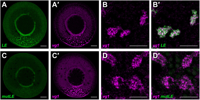 FIGURE 2:. Assembly into L-bodies is correlated with vegetal localization. (A) A cryosection of a stage II oocyte is shown, with microinjected fluorescently labeled LE RNA (green) and endogenous vg1 mRNA (A′) detected by FISH (magenta). The vegetal cortex at the bottom, and the scale bar = 50 µm. (B) High magnification view of the vegetal cytoplasm of a stage II oocyte with endogenous vg1 mRNA (magenta) detected by FISH and microinjected LE RNA (green) shown merged in B′. Scale bar = 10 µm. (C) A cryosection of a stage II oocyte is shown, with microinjected fluorescently labeled mutant LE RNA (mutLE) in green and endogenous vg1 mRNA (C′) detected by FISH in magenta. The vegetal cortex at the bottom and the scale bar = 50 µm. (D) High magnification view of the vegetal cytoplasm of a stage II oocyte with endogenous vg1 mRNA (magenta) detected by FISH and microinjected mutLE RNA (green) shown merged in D′. Scale bar = 10 µm. |