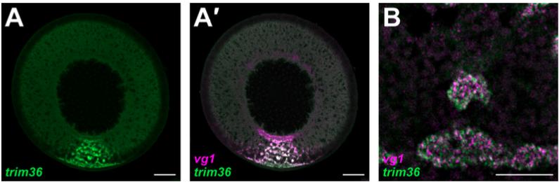 Figure S1. Trim36 mRNA is enriched in L-bodies. Trim36 mRNA (Cuykendall and Houston, 2009), which is transported to the vegetal hemisphere during stages II-II of oogenesis, is contained in L-bodies. (A) A cryosection of a stage II oocyte probed by FISH for trim36 mRNA (green), shown merged in A¢ with vg1 mRNA (magenta) is shown. The vegetal cortex at the bottom. Scale bar=50 μm. (B) Higher magnification view of trim36 mRNA (green) and vg1 mRNA (magenta) in the vegetal cytoplasm of a stage II oocyte. The vegetal cortex is at the bottom; scale bar=10 μm. |
