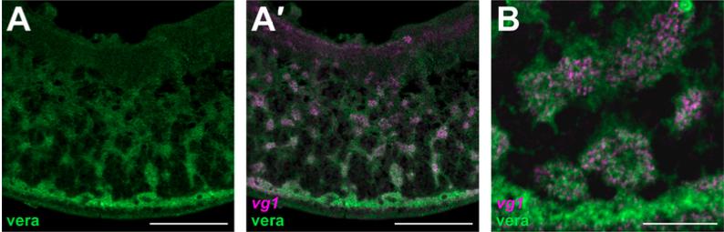 Figure S2. Vera protein is enriched in L-bodies. (A) Combined FISH-IF was used to detect vera protein (A, green) in the vegetal cytoplasm of a stage II oocyte, merged with vg1 mRNA (magenta) in A¢. The vegetal cortex is at the bottom; scale bar=50 μm. (B) High magnification view of the vegetal cytoplasm of a stage II oocyte showing colocalization of vg1 mRNA (magenta) and vera protein (green). Scale bar=10 μm. |