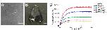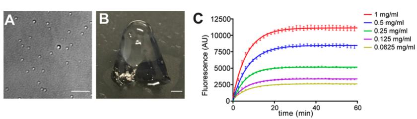 Figure S3. Xenopus oocyte RNA stains with thioflavin and phase-separates in vitro. (A) DIC Image of droplets formed at 1 mg/mL oocyte RNA. Scale bar=5μm. RNA droplets were imaged at room temperature with a Zeiss Axiovert 200M Fluorescent Microscope using a 100 Ì oil Plan- NEOFLUAR objective (NA=1.3). Images were taken in the AxioVision 4.8 software on a Hamamatsu ORCA-ER digital camera. (B) Image of RNA gel formed at 10 mg/mL Xenopus oocyte RNA. Scale bar=1mm. (C) Stage II-III Xenopus oocyte RNA was serially diluted into buffer containing 125 nM thioflavin-T (in 10 mM Tris pH=7.4, 4 mM MgCl2). After heating to denature RNA secondary structure, thioflavin fluorescence was monitored at 482 nm. RNA concentrations were as follows: 0.0625 (yellow), 0.125 (purple), 0.25 (green), 0.5 (blue), and 1 (red) mg/mL. |