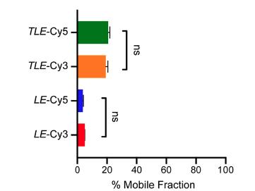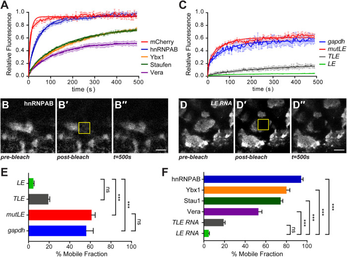 FIGURE 6:. L-bodies contain dynamic proteins and nondynamic localized RNAs. (A) Stage II oocytes expressing mCh, or the following mCh-tagged proteins: hnRNPAB, Ybx1, Stau1, and Vera, were microinjected with Cy5-labeled vg1 LE RNA to mark L-bodies. Recovery curves are shown for mCh (red), mCh-hnRNPAB (blue), Ybx1-mCh (orange), Stau1-mCh (green), and Vera-mCh (purple). Error bars indicate standard error of the mean (SEM). (B) An image of the vegetal cytoplasm of an oocyte microinjected with mCh-hnRNPAB is shown, with a 10 µm2 ROI (yellow); scale bar = 10 µm. B′ and B′′ show the postbleach and 500 s time points, respectively. Photobleaching was corrected using the ImageJ plugin CorrectBleach V2.0.2. Zenodo (Miura et al., 2014) (C) Stage II oocytes were microinjected with Cy3-labeled vg1 LE RNA to mark L-bodies and coinjected with the following Cy5-labeled RNAs for FRAP analysis: gapdh, mutated vg1 LE (mutLE), vegT LE (TLE), or vg1 LE (LE). Recovery curves are shown for gapdh RNA (blue), mutLE RNA (red), TLE RNA (gray), and LE RNA (green). Labeling of RNAs with Cy3 vs. Cy5 does not affect dynamics (see Figure S4). Error bars show SEM. (D) An image of the vegetal cytoplasm of an oocyte microinjected with Cy5-labeled LE RNA is shown, with a 10 µm2 ROI (yellow); scale bar = 10 µm. D′ and D′′ show the postbleach and 500 s time points, respectively. Photobleaching was corrected using the ImageJ plugin CorrectBleach V2.0.2. Zenodo (Miura et al., 2014) (E) The mobile fraction is shown for LE RNA (green, 4.8 ± 0.6%), TLE RNA (gray, 19.2 ± 1.4%), mutLE RNA (red, 61.2 ± 3.6%), and gapdh RNA (blue, 56.1 ± 6.7%), determined by FRAP as in panel C. The results from 7 oocytes per RNA are shown and error bars show SEM. P-values were calculated using one-way ANOVA with Tukey’s multiple comparison correction; ***p < 0.001, ns is not significant. (F) The mobile fraction for mCh-hnRNPAB (blue, 94.2 ± 1.9%), Ybx1-mCh (orange, 80.1 ± 3.2%), Stau1-mCh (dark green, 74.5 ± 2.0%), Vera-mCh (purple, 52.9 ± 3.4%), TLE RNA (gray, 19.2 ± 1.4%), and LE RNA (green, 4.8 ± 0.6%) was determined by FRAP, as in panels A and C. The results from seven oocytes per protein and RNA are shown and error bars indicate SEM. P values were calculated using one-way ANOVA with Tukey’s multiple comparison correction; ***p < 0.001, ns is not significant. |