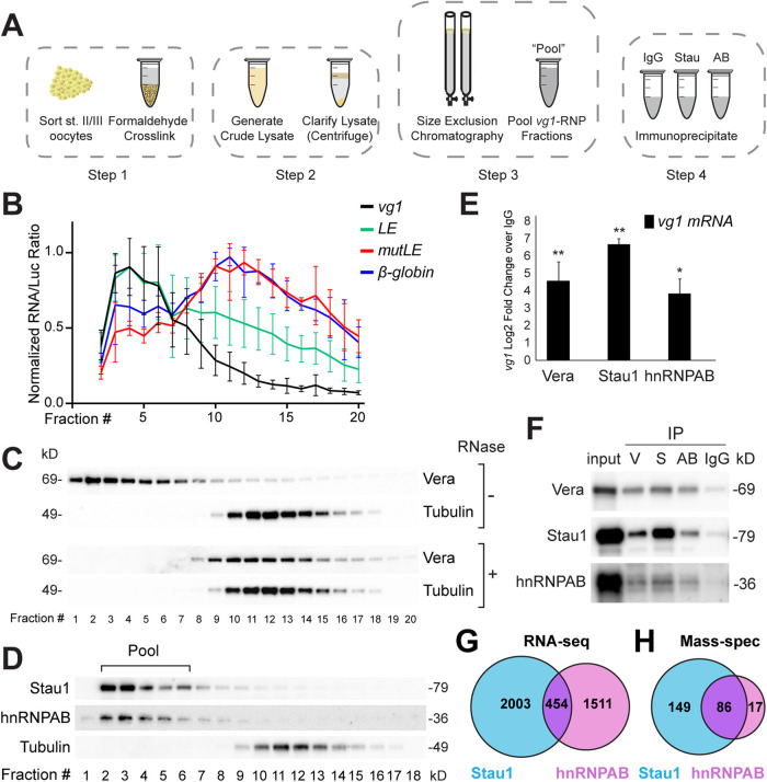 FIGURE 3: Isolation of L-bodies. (A) Schematic of the L-body isolation procedure. Stage II/III oocytes were formaldehyde cross-linked, homogenized, clarified by centrifugation, and fractionated by SE chromatography. Fractions containing vg1 mRNA were pooled and divided equally for immunoprecipitations using anti-Stau1 (Stau) and anti-hnRNPAB (AB) antibodies, with IgG as a negative control. (B) Stage IIâIII oocytes were microinjected with LE RNA (green), nonlocalizing mutLE RNA (red), and nonlocalizing β-globin RNA (blue). Oocyte lysates were subjected to SE chromatography and the levels of the microinjected RNAs and endogenous vg1 mRNA (black) were measured in SE column fractions by RT-qPCR, normalized to luciferase control RNA (luc). Error bars represent standard error of the mean (SEM); n = 4 columns. (C) Oocyte lysate was treated with RNase A prior to SE chromatography, followed by immunoblot analysis with anti-Vera and anti-Tubulin antibodies. Column fractions from untreated (â) lysate are shown at the top and column fractions from RNase-treated (+) lysate are shown at the bottom. (D) Immunoblot analysis is shown, of SE column fractions probed with anti-Stau1, anti-hnRNPAB, and anti-Tubulin. The input (load) is at the left and fraction numbers are shown at the bottom. Stau1 and hnRNPAB chromatograph primarily in the void volume; fractions 2â5, which were pooled for further purification. (E) Pooled SE column fractions (2â5) were immunoprecipitated (IPed) using anti-Vera, anti-Stau1, anti-hnRNPAB, and IgG. Following isolation of bound RNA, vg1 RNA was detected by RT-qPCR, with normalization to a luciferase RNA control. Shown is log2-fold enrichment for vg1 RNA from the Vera, Stau1, and hnRNPAB co-IPs over IgG. n = 5 and error bars represent SEM. **p < 0.01, *p < 0.05. (F) Pooled SE column fractions (2â5) were IPed using anti-Vera (V), anti-Stau1 (S), anti-hnRNPAB (AB), and IgG. After SDSâPAGE, co-IP of Vera, Stau1, and hnRNPAB were confirmed by immunoblotting with anti-Vera, anti-Stau1, and anti-hnRNPAB. (G) RNA-seq was performed on parallel IPs using anti-Stau1, anti-hnRNPAB, and IgG. A Venn diagram shows the overlap between hnRNPAB (magenta) and Stau1 (blue); 454 RNAs were identified as enriched over IgG in both the hnRNPAB and Stau1 IPs. See also Tables S1-S4. (H) MS was performed on parallel IPs using anti-Stau1, anti-hnRNPAB, and IgG. A Venn diagram shows the overlap between hnRNPAB (magenta) and Stau1 (blue); 86 proteins were identified as significantly enriched over IgG in both the hnRNPAB and Stau1 IPs. |