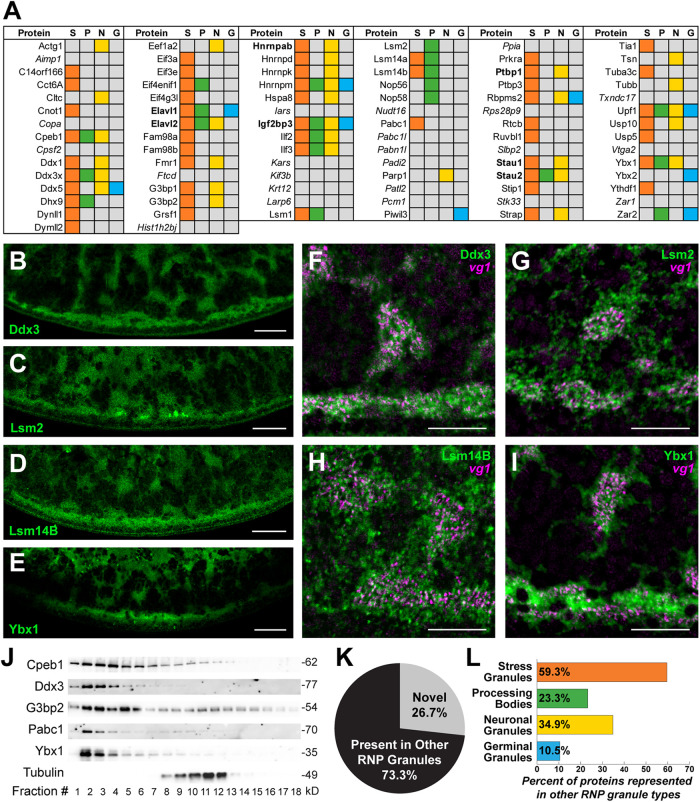 FIGURE 4:. L-bodies contain protein components common to other classes of cytoplasmic RNP granules. (A) Protein constituents of L-bodies are also found in stress granules (S, orange), P-bodies (P, green), neuronal granules (N, yellow), and germ granules (G, blue). Proteins found in L-bodies but not reported in other granules, are italicized and previously known vg1 RBPs are bolded. (B–I) IF and combined FISH-IF were performed to validate potential protein constituents of L-bodies. (B, C) Shown are IF images of stage II oocytes using (B) anti-Ddx3, (C) anti-Lsm2, (D) anti-Lsm14B, and (E) anti-Ybx1. The vegetal cortex is at the bottom; scale bars = 20 µm. (F–I) Shown are FISH-IF images of the vegetal cytoplasm of stage II oocytes with the vegetal cortex at the bottom; scale bars = 10 µm. Shown in magenta is vg1 mRNA detected by FISH. Merged in green is IF using (F) anti-Ddx3, (G) anti-Lsm2, (H) anti-Lsm14B, and (I) anti-Ybx1. See also Supplemental Table S5. (J) Immunoblot analysis is shown of SE column fractions probed using anti-Cpeb1, anti-Ddx3, anti-G3bp2, anti-Pabc1, anti-Ybx1, and anti-Tubulin antibodies. The fraction numbers are indicated at the bottom. (K) Overlap (black, 73.3%) of L-body constituents with other cytoplasmic granules; unique proteins are indicated by gray (26.7%). (L) The percentage of identified L-body proteins that are found in other cytoplasmic RNP granule types: stress granules (59.3%, 51 of 86), P-bodies (23.3%, 20 of 86), neuronal granules (34.9%, 30 of 86), and germinal granules (10.5%, 9 of 86). See also Supplemental Table S7. |