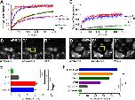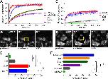 FIGURE 6: L-bodies contain dynamic proteins and nondynamic localized RNAs. (A) Stage II oocytes expressing mCh, or the following mCh-tagged proteins: hnRNPAB, Ybx1, Stau1, and Vera, were microinjected with Cy5-labeled vg1 LE RNA to mark L-bodies. Recovery curves are shown for mCh (red), mCh-hnRNPAB (blue), Ybx1-mCh (orange), Stau1-mCh (green), and Vera-mCh (purple). Error bars indicate standard error of the mean (SEM). (B) An image of the vegetal cytoplasm of an oocyte microinjected with mCh-hnRNPAB is shown, with a 10 µm2 ROI (yellow); scale bar = 10 µm. Bâ² and Bâ²â² show the postbleach and 500 s time points, respectively. Photobleaching was corrected using the ImageJ plugin CorrectBleach V2.0.2. Zenodo (Miura et al., 2014 blue right-pointing triangle) (C) Stage II oocytes were microinjected with Cy3-labeled vg1 LE RNA to mark L-bodies and coinjected with the following Cy5-labeled RNAs for FRAP analysis: gapdh, mutated vg1 LE (mutLE), vegT LE (TLE), or vg1 LE (LE). Recovery curves are shown for gapdh RNA (blue), mutLE RNA (red), TLE RNA (gray), and LE RNA (green). Labeling of RNAs with Cy3 vs. Cy5 does not affect dynamics (see Figure S4). Error bars show SEM. (D) An image of the vegetal cytoplasm of an oocyte microinjected with Cy5-labeled LE RNA is shown, with a 10 µm2 ROI (yellow); scale bar = 10 µm. Dâ² and Dâ²â² show the postbleach and 500 s time points, respectively. Photobleaching was corrected using the ImageJ plugin CorrectBleach V2.0.2. Zenodo (Miura et al., 2014 blue right-pointing triangle) (E) The mobile fraction is shown for LE RNA (green, 4.8 ± 0.6%), TLE RNA (gray, 19.2 ± 1.4%), mutLE RNA (red, 61.2 ± 3.6%), and gapdh RNA (blue, 56.1 ± 6.7%), determined by FRAP as in panel C. The results from 7 oocytes per RNA are shown and error bars show SEM. P-values were calculated using one-way ANOVA with Tukeyâs multiple comparison correction; ***p < 0.001, ns is not significant. (F) The mobile fraction for mCh-hnRNPAB (blue, 94.2 ± 1.9%), Ybx1-mCh (orange, 80.1 ± 3.2%), Stau1-mCh (dark green, 74.5 ± 2.0%), Vera-mCh (purple, 52.9 ± 3.4%), TLE RNA (gray, 19.2 ± 1.4%), and LE RNA (green, 4.8 ± 0.6%) was determined by FRAP, as in panels A and C. The results from seven oocytes per protein and RNA are shown and error bars indicate SEM. P values were calculated using one-way ANOVA with Tukeyâs multiple comparison correction; ***p < 0.001, ns is not significant. |