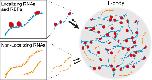 FIGURE 7:. Model for L-body structure and assembly. Localizing RNAs (blue) interact with specific RNA-binding proteins (RBPs; red) that facilitate local enrichment. Nonlocalizing RNAs (gold) lack binding sites for these RBPs and do not condense with other localized RNAs. Specific RBPs facilitate enrichment (large arrows) of localized RNAs in L-bodies (gray). L-body enrichment results in high local RNA concentrations, facilitating RNA–RNA, RNA–protein, and protein–protein interactions and formation of a nondynamic RNA phase enmeshed in a more dynamic protein phase. Nonlocalized RNAs (and proteins) are not excluded from L-bodies, and can freely move in and out (double arrows). |