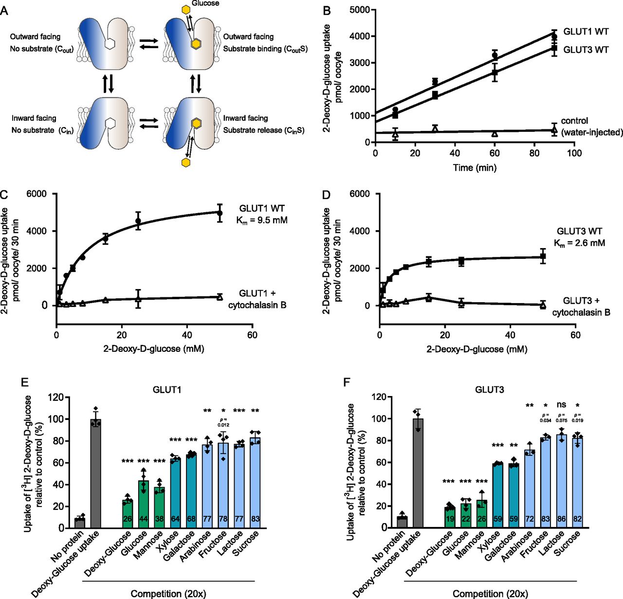 (A) Schematic model for transport by GLUTs, alternating between two major conformations with the substrate-binding site exposed to the inside and outside of the cell. Transition between these conformations leads to sugar transport across the membrane following the substrate concentration gradient. (B) Uptake of 2-DG into GLUT1-injected Xenopus oocytes (circle), GLUT3-injected oocytes (squares) or water-injected oocytes (open triangles) at an initial outside concentration of 5 mM 2-DG. For both proteins, 2-DG uptake was linear in the range of 90 min. Data for all assays are mean ± SD of three or more replicate experiments. (C) Determination of the kinetic parameters for the transport of 2-DG of GLUT1. The data were fitted using the MichaelisâMenten non-linear fit, yielding a Km = 9.5 ± 1.0 mM and Vmax = 5,988 ± 226 pmol/oocyte/30 min. Sugar uptake was inhibited in GLUT1-injected oocytes exposed to cytochalasin B. (D) Determination of the kinetic parameters for the transport of 2-DG of GLUT3. The data were fitted using the MichaelisâMenten non-linear fit, yielding a Km = 2.6 ± 0.4 mM and Vmax = 2,731 ± 94 pmol/oocyte/30 min. Sugar uptake was inhibited in GLUT3-injected oocytes exposed to cytochalasin B. (E) Substrate selectivity of GLUT1 determined by competition assay in oocytes exposed to 5 mM 2-DG and 20à fold of the competing sugar, for 15 min. (F) Substrate selectivity of GLUT3 determined by competition assay in oocytes exposed to 5 mM 2-DG and 20à fold of the competing sugar, for 15 min. Data information: In (B, C, D, E, F) Data for all assays are mean ± SD of three or more replicate experiments. In (E, F) ns, Not significant; *P ⤠0.05; **P ⤠0.01; and ***P ⤠0.001 by t test. P-value is shown for ns and *.