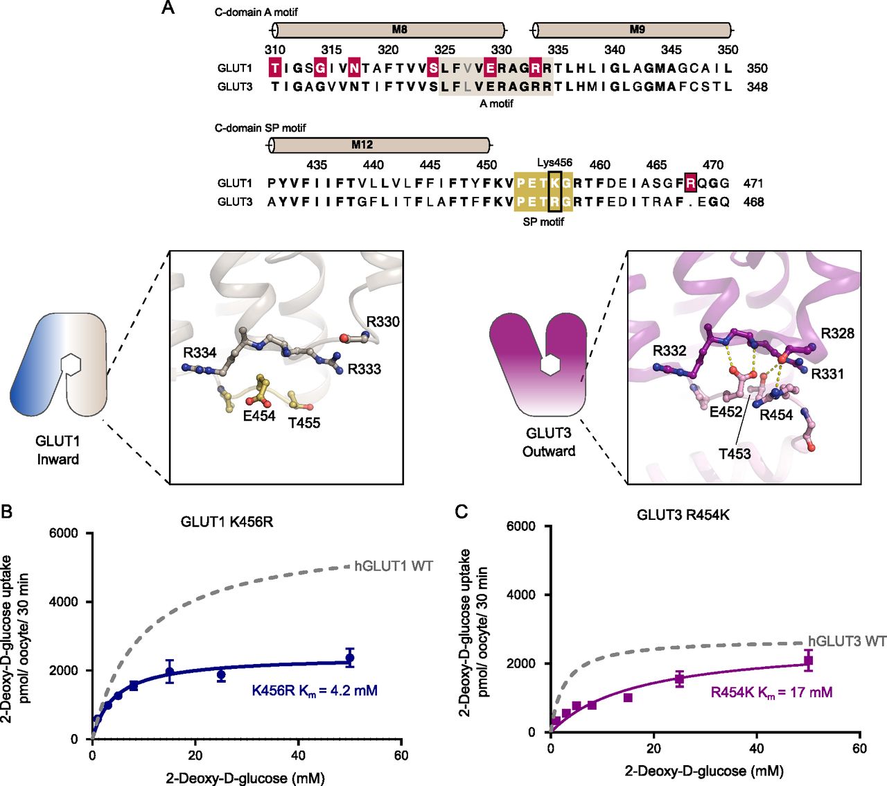 distances). (B) GLUT1 K456R: Km = 4.2 ± 0.6 mM and Vmax = 2,427 ± 90 pmol/oocyte/30 min. (C) GLUT3 R454K: Km = 17 ± 3.3 mM and Vmax = 2,638 ± 234 pmol/oocyte/30 min. Data information: In (B, C) MichaelisâMenten analysis of 2-DG uptake in oocytes. Data represent the mean ± SD of three or more replicate experiments.