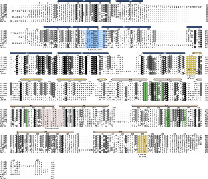 Figure S1. Multiple sequence alignment between human GLUT1 and other structurally characterized members of the Sugar Porter family.Alignment between human GLUT1 (UniProt P11166), GLUT2 (UniProt P11168), GLUT3 (UniProt P11169), GLUT4 (UniProt P14672), rGLUT5 (UniProt P43427), bGLUT5 (UniProt P58353), atSTP10 (UniProt Q9LT15), XylE (UniProt P0AGF4), and GlcPse (UniProt A0A0H2VG78). Conserved residues are highlighted with gray-scale. Alpha helices as found in GLUT1 are represented above the sequence as colored tubes. Residues highlighted in blue and brown are the N-domain and C-domain A motifs, respectively. The Sugar Porter motifs in both domains are highlighted in yellow. In green are residues that create the central substrate binding-site, perfectly conserved between GLUT1-4.